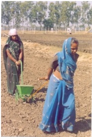 The seed drill have been refined for women workers using anthropometric data. It consists of a handle, hopper for seed and fertilizer, peg type ground wheel, a roller with cells and a hook for pulling the drill. The metering roller is directly mounted on the ground wheel shaft. The seed drill needs to be operated in well-prepared field. The seed drill is operated by two workers, i.e. one for pulling and another for pushing and guiding. Rope is tied to hook provided in front of the seed drill for pulling.