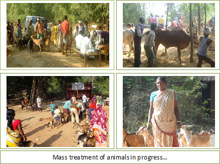 The Directorate of Research on Women in Agriculture (DRWA), Bhubaneswar celebrated ‘Women in Agricultural Day’ by organizing an Animal Health Camp at village Tarajodi, in Shyamakhunta block of Mayurbhanj district in Odisha, adopted under Tribal Sub Plan. Though farming is the primary occupation of the village, animal husbandry plays a major role in supporting livelihood, especially for the farm women. On an average, each family rears about 20 goats and 15-25 poultry birds, in addition to draught and milch animals. The recent cyclone ‘Phailin’, and the subsequent floods, resulted in heavy mortality of livestock and threat of contagious diseases in this area. Realizing the significance of livestock in the livelihood of tribal families, and the poor access to animal health care services due to the remoteness of this village, this camp was organized in association with the Animal Resources Department, Govt. of Odisha, Mayurbhanj, to provide veterinary services at the doorstep. About 500 cattle, buffalo as well as small animals such as goats and poultry birds were treated in the camp. Apart from vaccination, mass treatment regarding debility, anorexia, diarrhea, delayed maturity, sprain, cough, fever, wounds, bacillary white diarrhea etc. was given to the animals. The beneficiaries were also given tips on routine animal health care.