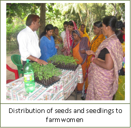 Other events included a quiz competition conducted at Otarakera, in which the farm women candidly participated. A Health Camp was organized at Bajra Mahakali Pittra in Jhadeswarpur, in collaboration with Department of Health, Salepur and an NGO. Five hundred and thirty five villagers including men, women and kids were given treatment/ medical care for eye, skin, paediatrics and other physical ailments. Free medicines for anemia, deworming, cold etc., were given to the patients. In all the programmes, awareness on hygiene and sanitation was also highlighted in the light of ''Swachh Bharat Mission'' initiated by Honourable Prime Minister of India. About 1000 farmwomen, children, farmers and rural youth participated in the off-campus programmes, and showed keen interest in knowing about the research, extension and development activities of the Directorate. On-campus programme at the Directorate A sensitization workshop on nutrition gardening was organized on 6th December, 2014 at the Directorate. About 60 farmwomen and farmers from Nimapara block of Puri district participated in the programme. The Director, ICAR-DRWA highlighted the significance of nutrition garden for family nutrition and health security of farm families. Knowledge on layout of the plot, selection of seeds and cropping pattern to be followed in nutrition gardening was imparted. The importance of balanced diet, conservation of nutrients during cooking, hygiene and sanitation for maintaining healthy life were also stressed. PRA exercises were also carried out, in which the farm women were formed into different groups and prepared their village resource map. The visitors also had a field visit to the Directorate's farms and exposed to different low cost protective structures for horticultural crops, nutrition garden and orchards. |