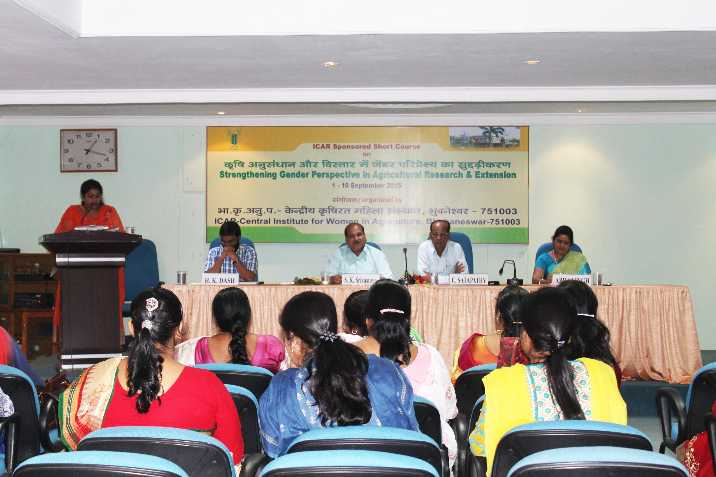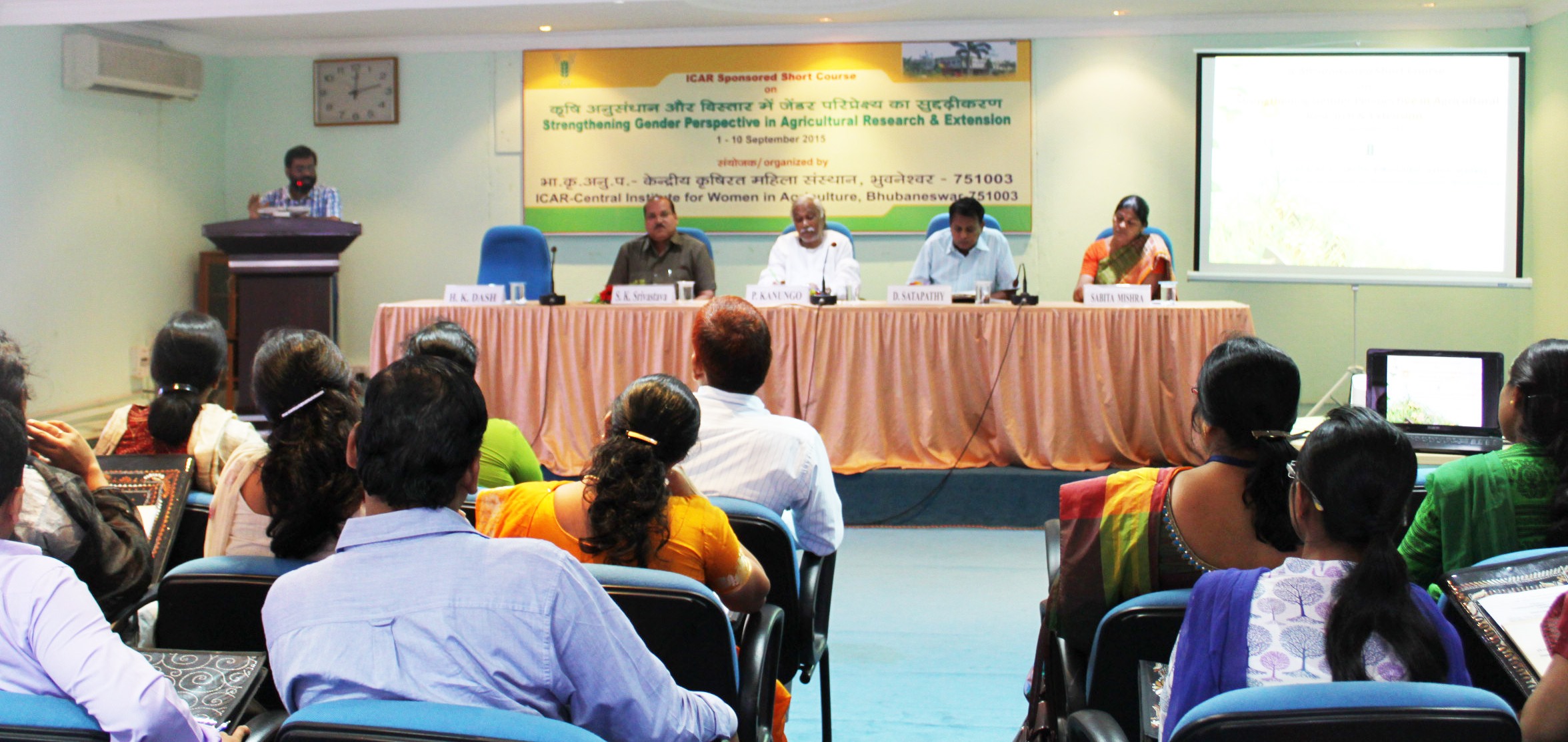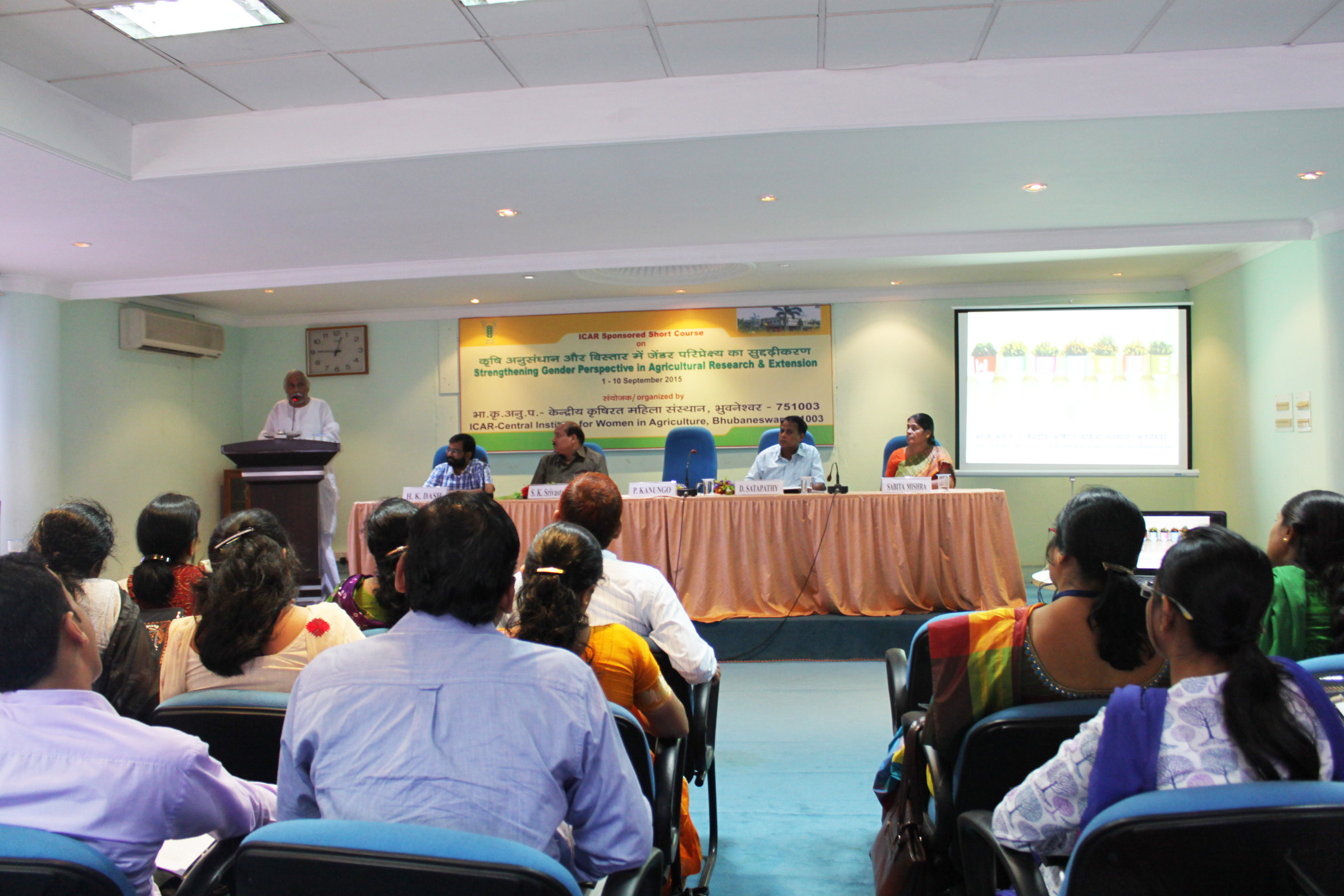 The ICAR sponsored Short Course on ‘Strengthening Gender Perspective in Agricultural Research and Extension’ was organized during September 1-10, 2015 at ICAR-CIWA, Bhubaneswar. The programme was inaugurated by the Chief Guest Shri Panchanan Kanungo, Former Minister of Finance, Govt. of Odisha in the presence of the Guest of Honour Shri Dillip Kumar Satpathy, Bureau Chief, Business Standard and Dr. S. K. Srivastava, Director, ICAR-CIWA, on September 1, 2015. Twenty two participants comprising 18 women and four(4) men from seven states attended the ICAR sponsored Short Course. A total of 27 theoretical and practical classes were covered in the programme. The Course contents included topics on gender related concepts, gender perspective in agricultural research and extension and how to strengthen the gender component in the programmes, gender disaggregated data- its importance and analysis, gender sensitization, gender analysis tools, technologies for safe food production and livelihood security of farm women, gender issues in livestock and fisheries, occupational risks and ergonomics, extension issues and gender mainstreaming, participatory monitoring and evaluation and a few others etc. Group exercises and field visits constituted an important part of the 10-day long Short Course. Finally, participants made presentation on scope and ways of strengthening gender perspective in their respective areas of research and extension. It was also agreed to make efforts spread the message of gender importance in agricultural research and extension through sensitization of different stakeholders and take up activities to bring visibility of women’s contribution in farm and households. The short course was ended with the valedictory function on September 10, 2015 which was graced by the Chief Guest Dr. C. Satapathy, Director, AMITY, Bhubaneswar and Dr. S. K. Srivastava, Director, ICAR-CIWA. The Course team comprised Dr.H.K.Dash, Dr. J.C.Jeeva, Dr. Ananta sarkar, Dr. Sabita Mishra and Dr. Abha Singh.