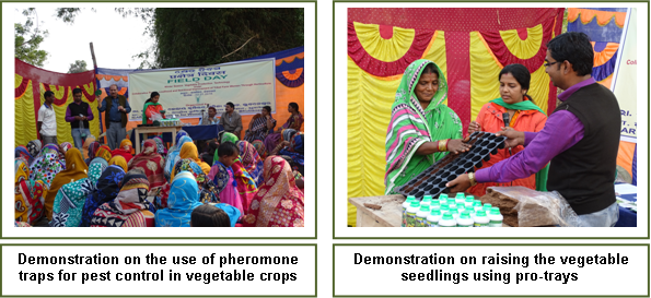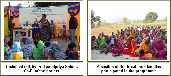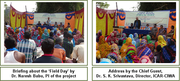 Field Day on ‘Winter Season Vegetable Production Technologies for Livelihood of Tribal Farmwomen’ ObservedA field day on ‘Winter season vegetable production technologies for livelihood of tribal farmwomen’ was observed by ICAR-CIWA at Village Kamaninga in Dhenkanal district on 2nd January, 2016. The programme was organized under the collaborative project on ‘Livelihood and Nutritional Improvement of Tribal Farm Families through Horticulture’. The programme was started with the briefing about the ‘Field Day’ by Dr. Naresh Babu, Principal Scientist and PI of the Project. The Chief Guest of the programme, Dr. S. K. Srivastava, Director, ICAR-CIWA highlighted the research and extension activities of ICAR-CIWA for the empowerment of farmwomen. Dr. Laxmipriya Sahoo, Scientist and Co-PI of the project delivered a technical talk on the significance of quality seeds in vegetable crop production. The technical lectures were followed by demonstration on raising vegetable seedlings using pro-trays and the use of pheromone traps for effective pest control in vegetable crops. In the ‘Scientists-Farm Families Interface’, the technical queries of the farmers were answered by the Scientists and Technical Staff of ICAR-CIWA. On-field advisories were also issued to the participants on improved vegetable production technologies, seed management and pest control measures. As part of the event, a quiz programme on vegetable production technologies was conducted and prizes in the form of critical inputs were distributed to the farmwomen and men. The participants including the children were also sensitized about the ‘Swachch Bharat Abhiyan’ and the significance of keeping the surroundings neat and tidy. A ‘Community Lunch’ was also organized towards the end of the progarmme. About 80 tribal farm families participated in the programme. Shri. Jairam Biswal, Admn. Officer, ICAR-CIWA participated in the programme as guest of honour. The programme was coordinated by the project team, Dr. Naresh Babu, Dr. J. C. Jeeva, D. Laxmipriya Sahoo, Smt. Tapaswini Sahoo and Shri. Sanjay Kr. Behera. |