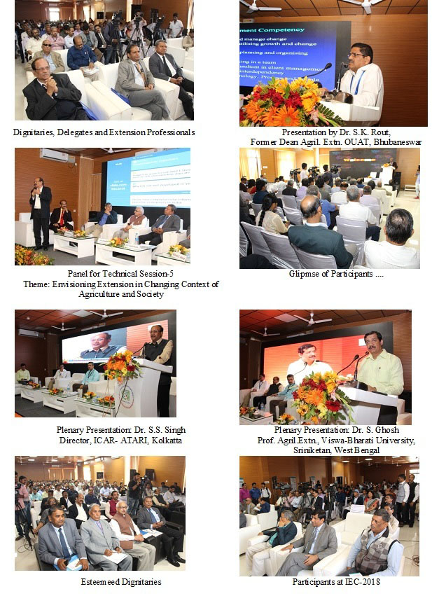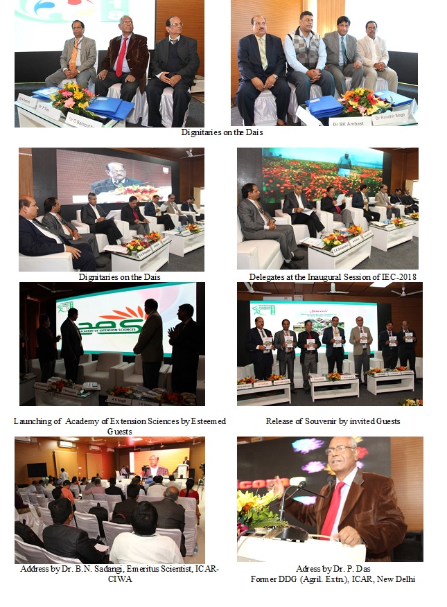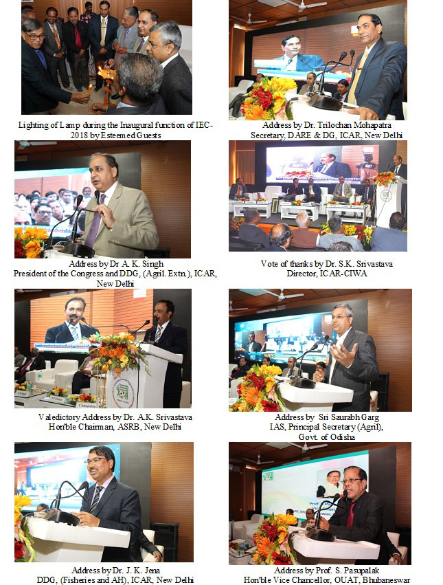 1st International Extension Congress-2018 New Horizons of Extension: Challenges and Opportunities February 1-3, 2018 at ICAR-CIWA, Bhubaneswar, Odisha, India1st International Extension Congress-2018 was organized by Orissa Society of Extension Education at ICAR-Central Institute for Women in Agriculture, Bhubaneswar from 1-3 February, 2018 with a Vision of “Incessantly evolving and developing Extension Education–the Art and Science for meeting Challenges and Harnessing Opportunities” and with a Mission of “Providing platform to evolve and develop the subject based on the objective-oriented research related to identified theme areas and interaction among the Extension Professionals” with leadership of Dr. S.K. Srivastava, Director, ICAR-CIWA and Chairman of Local Organizing Committee. The organizing partners were: ICAR-Central Institute for Women in Agriculture, Bhubaneswar, ICAR-National Rice Research Institute, Cuttack, Orissa University of Agriculture and Technology, Bhubaneswar and Bisra Agriculture University, Ranchi while ICAR-Indian Agricultural Research Institute, New Delhi and Academy of Extension Sciences were Congress collaborators. The Inaugural programme was held on 2nd February 2018 in which Dr. Trilochan Mohapatra, Hon'ble Secretary, DARE and DG, ICAR graced the occasion as Chief Guest. Dr. Mohapatra highlighted the importance of Extension as the base of research for development in Agriculture. He also highlighted the importance of ICAR-CIWA as the only institute working for the empowerment of women in agriculture, Globally. Dr A. K. Singh, President of the Congress and DDG, (Agril. Extn.), ICAR, New Delhi, Dr. J. K. Jena, DDG, (Fisheries and AH), ICAR, New Delhi, Prof. S. Pasupalak, Hon'ble Vice Chancellor, OUAT, Bhubaneswar and Dr. Saurabh Garg, IAS, Principal Secretary (Agriculture), Govt. of Odisha were the Guests of Honour. The entire programme was distributed into ten technical sessions in which emerging challenges and innovative approaches in extension, advancements and futuristic assessment of core areas of extension, envisioning extension in changing context of agriculture and society, professionalism and ethics in extension to several other themes were discussed through interactive presentations and panel discussions. The concluding technical session was based upon interface among all the stakeholders. Besides, the programme was graced by several delegates in the field of agriculture and allied disciplines from within and outside India. The programme was attended by various Professionals including Scientists, Policy makers, Extension Personnel and Students from the country as well as abroad. The event ended with the Valedictory programme where Dr. A.K. Srivastava, Hon'ble Chairman, ASRB, New Delhi graced the occasion as Chief Guest. Dr. Srivastava signified the importance of Extension in bringing Green Revolution in India and its role for development of livestock sector. Prof D.P. Ray, Former Vice Chancellor, OUAT, Bhubaneswar was the Guest of Honour. Dr. A.K. Singh, DDG (Agril. Extn.), ICAR, New Delhi had presided over the Inaugural and Valedictory Sessions while Dr. S.K. Srivastava, Director, ICAR-CIWA offered vote of thanks during both the occasions. On the eve of Congress, 20 nos. of exhibition stalls were arranged to display the newly emerging extension technologies of ICAR/SAUs. Total 11 participants were awarded including 10 best poster presentation and one best Ph.D. colloquium.