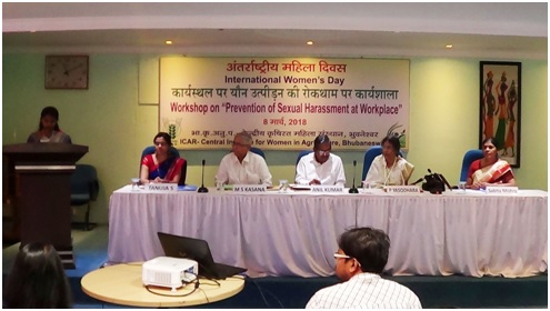 Celebration of International Women's Day at ICAR-CIWA on 8th March, 2018ICAR-CIWA celebrated International Women's Day on March 8, 2018 by organising a workshop on the “Prevention of Sexual Harassment at Workplace” in collaboration with National Academy for Human Resource Development (NAHRD), New Delhi. Dr. Tanuja S., Nodal officer for the programme, welcomed all the delegates and participants. The inaugural function was graced by Prof. (Dr.) P. Yasodhara, former Special Officer of College of Home Science, OUAT, Bhubaneswar as the Chief Guest. She highlighted the significance of the day and contributions made by women to the society by playing various roles as mother, daughter, wife and daughter-in-law. The in-charge Director, Dr. Anil Kumar emphasized the importance of the Day and congratulated all women for their endless and significant endeavours. The resource person for the workshop, Shri Mahabir Singh Kasana, former Joint Director, Institute of Secretariat Training and Management, Department of Personnel and Training, Government of India graced the occasion as Guest of Honour. During the workshop he delivered informative lectures citing a number of case studies on "Prevention of Sexual Harassment at Workplace". He also sensitized the participants about the Prevention of Sexual Harassment Act, 2013, the importance of Internal Complaints Committee (ICC), steps for conducting inquiry, rules and provisions for the women employees at the workplace etc. Around 90 participants attended the workshop which included women scientists, women technical staff, administrative staff and women’s cell members from different ICAR Institutes, i.e. ICAR-CIWA, ICAR-IIWM, ICAR-CHES, ICAR-NRRI and OUAT, Bhubaneswar. There were a series of interactive sessions in the workshop and the participants also got an opportunity to clarify their queries on the topic during the event. The workshop concluded with formal vote of thanks by Dr. Sabita Mishra, Co-Nodal Officer of the programme.