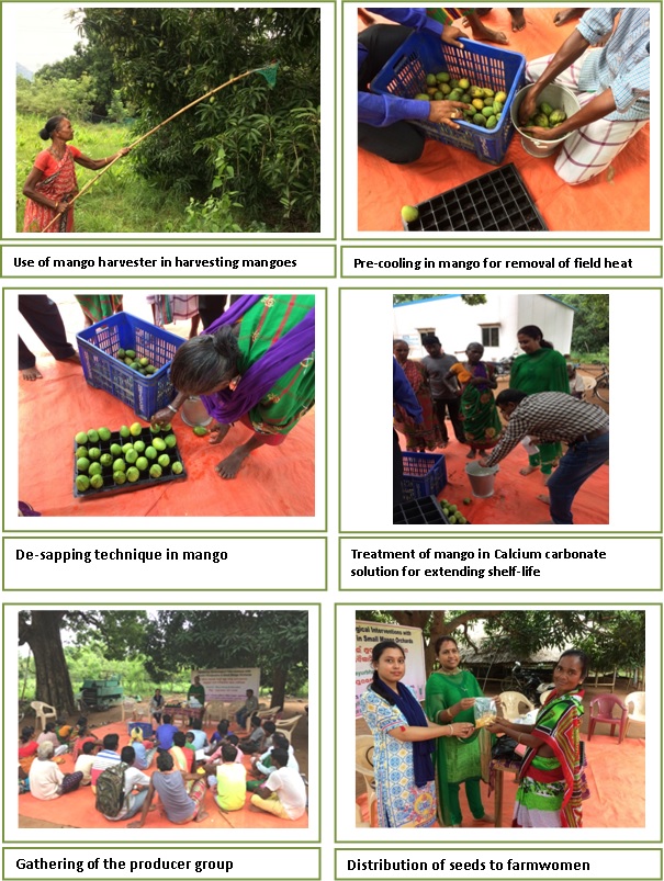 ICAR-CIWA empowered tribal group of 50 farmers and farm women of Baskitala Dashehari Producer Group in a backward district Mayurbhanj of Odisha on "Post-harvest management of mango"A tribal group of 50 farmers and farm women of Baskitala Dashehari Producer Group in a backward district Mayurbhanj of Odisha were empowered on "Post-harvest management of mango" through training cum demonstration organized under the project "Optimizing technological interventions with Gender perspective in small scale mango orchards" at Baskitala village of Mayurbhanj district on 26 June, 2018. The Training programme offered a platform to know about the post-harvest management practices of mango for extending the shelf life of the fruits and for fetching better price in the market. The farmer group was demonstrated with harvesting of fruits with a women friendly mango harvester, which enabled them to harvest 800-1000 fruits within 1 hr by reducing their drudgery and increasing the work efficiency. After harvesting of fruits, the women farmers were imparted hands on skill in pre-cooling and de-sapping techniques. They were also made aware of sorting and grading for getting better remuneration through sale of quality mangoes. Techniques of calcium carbonate treatment, hot water treatment and modern ripening technology through use of ethylene were also imparted. The women farmers were very enthusiastic to learn and practice the advanced technologies of post-harvest management to produce quality mangoes for better marketing. The programme was graced by Dr. Sanghamitra Pattnaik, Senior Scientist and Head of KVK Mayurbhanj. Dr. Sanghamitra Pattnaik during her technical talk deliberated the significance of value addition in mango and the potential role of women farmers in such activities. The queries of the farmers related to mango farming were also entertained and they were provided with technical guidance on canopy management and nutrient management. Towards the end of the programme, the farmers and farm women were distributed with brinjal seeds (cv. Arka Neelachal Kranti and Arka Neelachal Shyama), chilli seeds (cv. Arka Neelachal Agni) and Plant Growth Regulator (Ethephon). The brinjal and chilli seeds were provided as critical inputs to practice intercropping in mango orchards as an additional source of income. During distressed sale of vegetables, the group was also advised to practice vegetable seed production as an alternate source of livelihood. The training programme was successfully organized by Ms. Ankita Sahu, Scientist from ICAR-CIWA and Sri Manoranjan Prusty, Sr. Technical Assistant, ICAR-CIWA.