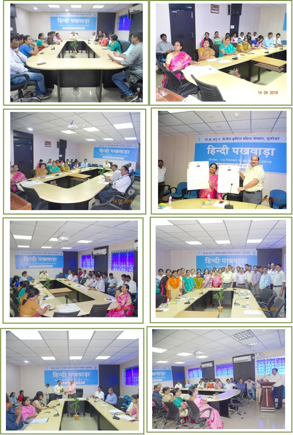 हिंदी पखवाडाराजभाषा हिंदी को बढ़ावा देने के लिए दिनांक 14 सितम्बर से 28 सितम्बर 2018 तक भा. कृ. अनु. प. - केन्द्रीय कृषिरत महिला संस्थान, भुवनेश्वर में हिंदी पखवाडा का आयोजन किया गया है | हिंदी दिवस की सुभारम्भ 14 सितम्बर 2018 को संस्थान के अध्यक्ष महोदय के द्वारा किया गया था | हिंदी पखवाडा के दौरान हिंदी में निबंध लिखन प्रतियोगिता, कंप्यूटर पर यूनिकोड में टंकण प्रतियोगिता, स्वरचित कविता पाठ एवं हस्तलेख प्रतियोगिता का आयोजन किया गया था| संस्थान के सभी अधिकारी/ कर्मचारी/ पोजेक्ट स्टाफ हिंदी प्रतियोगिताओं में भारी मात्रा में बढचढ कर भाग लिए |