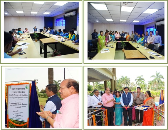 Dr. Narendra Singh Rathore, Deputy Director General (Ag. Education), ICAR, New Delhi visited ICAR-Central Institute for Women in Agriculture, Bhubaneswar on 6th November 2018 and inagurated the 'Ramp' constructed at the entrance of main building for differently abled persons.Hon'ble DDG, ICAR also reviewed research progress of the institute. All the Scientific, Technical and Administrative Staff were attended the meeting. At the outset, Dr. S. K. Srivastava, Director welcomed Hon'ble DDG and other participants to the meeting. He thanked DDG for his continued support to ICAR-CIWA by way of providing his valuable inputs and guidance for development of the Institute. While interacting with staff, Dr. Rathore advised the Scientists to focus on research priorities keeping in mind the welfare of farm women. He stressed on integrated farming system approach for doubling the farmer's income and advised the CIWA Scientists to demonstrate the same in the farmers field. He also emphasized that ICAR-CIWA should focused on Entrepreneurship development. The newly nominated In-charge Heads of the Divisions presented their future plan of action which was critically reviewed by the DDG, who offered valuable and constructive suggestions for increasing the visibility of the Institute. .