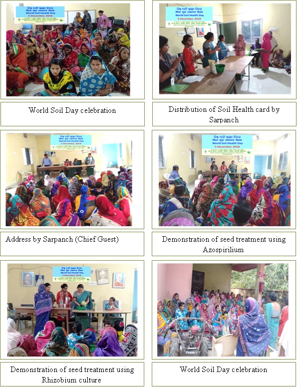ICAR-Central Institute for Women in Agriculture, Bhubaneswar celebrated World Soil Health Day on 5th December, 2018 at village cluster (Hariharpur, Godipali, Karada, Katrajhari & Abhimanpur) of Odogaon block,District Nayagarh, Odisha where farmers are mostly involved in production of pulses like green gram, Black Gram, Arhar, Lathyrus, Horse Gram contributing for maintenance of soil health. Celebration of World Soil Health Day in these villages was a true recognition for their endeavour in keeping the soil alive over generations. It also motivated other farmers and farmwomen of the locality. In this programme more than 100 farm women participated. Mrs. Sanjukta Sitha, Sarpanch, Hariharpur Gram Panchayat graced the programme as chief guest and emphasized on the importance of soil health and role of farmwomen in taking care of it. She also mentioned about the Mo Bari initiative taken by gram panchayat for community composting by women. She requested the gathering to spread Mo Bari to more villages. She expressed her gratitude to women for conserving the health of soil through pulse cultivation.