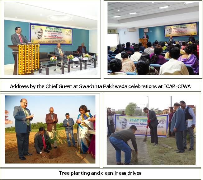 Participation of Secretary (DARE) & Director General (ICAR) at Swachhta Pakhwada Celebrations at ICAR-CIWADr. Trilochan Mohapatra, Secretary (DARE) & Director General (ICAR), New Delhi graced the Swachhta Pakhwada programme at ICAR - Central Institute for Women in Agriculture, Bhubaneswar on 29 December, 2018. During his address, he appreciated the Institute for its Swacchta activities in its adopted villages, and doing this campaign on Pan-India level, with the help of its All India Coordinated Research Project (Home Science) units in different states. He also urged the Scientists to work for the technological empowerment of Mahila Kisan. The programme was presided over by Dr. S. K. Srivastava, Director, ICAR-CIWA. In his welcome address, he highlighted the significance of celebrating Swachhta Pakhwada and briefed the gathering about the various activities organized as part of the campaign.