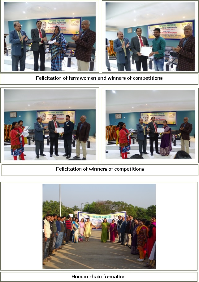 Tree planting, mass cleaning drive and human chain formation were also organized to spread the message of ''Clean India, Green India''. During the celebration, the winners of various competitions organized as part of the Swachhta Pakhwada campaign, Vigilance Awareness Week and Hindi Pakhwada, and best performing farm staff were also felicitated by the Chief Guest.