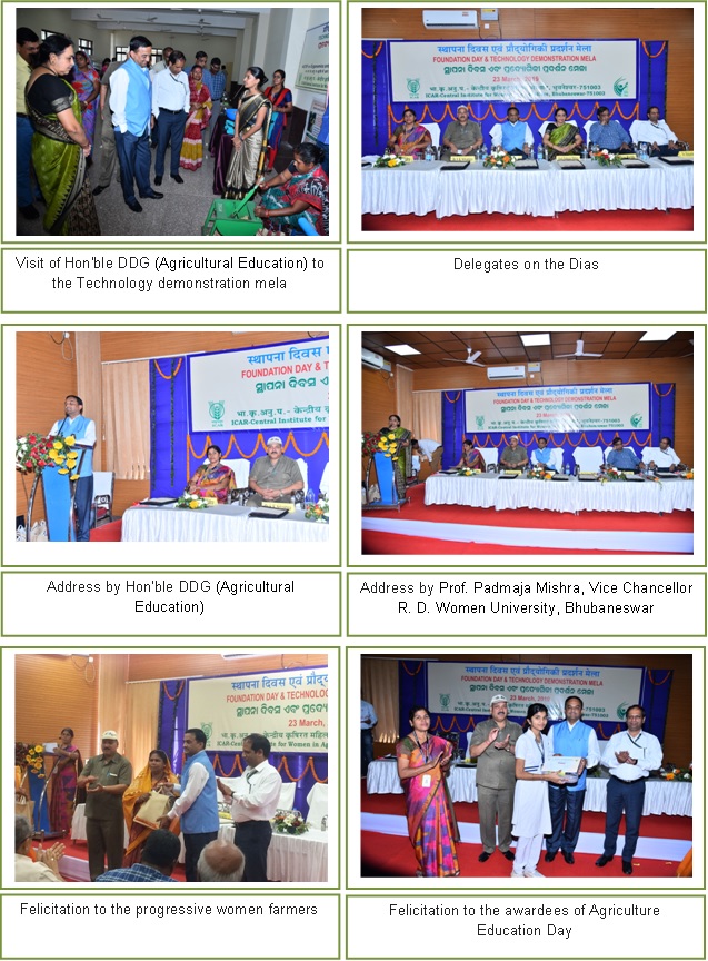 Technology Demonstration Mela and Scientists-Farmer Interface was organized at ICAR-CIWA on the occasion of Foundation day celebration on 23rd March, 2019. The function was graced by Shri Narendra Singh Rathore, Hon'ble DDG (Agricultural Education) ICAR, New Delhi as Chief Guest and Prof. Padmaja Mishra, Vice Chancellor Rama Devi Women University, Bhubaneswar as Guest of Honour. At the outset the Director of the Institute, Dr. S. K. Srivastava welcomed all the delegates and women farmers. Dr. Rathore during his address signified the potential role of ICAR-CIWA in mainstreaming women farmers for enhancing their empowerment. He emphasized that focus should be given upon enhancing the economic security of farm families through various women friendly profitable enterprises. Prof. P. Mishra highlighted the need of women empowerment in achieving economic stability, sustainability and profitability. The function was attended by 200 farm women from the Institute adopted villages covering Puri, Cuttack and Jagatsinghpur districts of Odisha. The Technology Demonstration Mela offered women farmers a platform to know about various drudgery reducing women friendly small tools and equipments viz. Groundnut decorticator & stripper, Seed treatment drum, Seed driller, Fertilizer broadcaster, Maize de-husker cum sheller, Seed cleaner cum grader, Potato slicer, Coconut de-husker etc. Other technologies suitable for women like backyard poultry rearing, hygienic fish drying rack, value added fish products, paddy straw mushroom and planting material production of horticultural crops were displayed. Women friendly harvesting bag developed under AICRP on Ergonomics and Safety in Agriculture was also demonstrated and received positive reviews from all the stakeholders. The Scientists-Farmer Interface organized during the event enabled the women farmers to clarify their farming related queries by a team of Scientific and technical experts from the Institute. On this occasion, some of the progressive women farmers were also felicitated for their outstanding contributions in field of agriculture, horticulture, dairy farming, poultry, aquaculture, mushroom farming and bee-keeping. Additionally, the winners of Agriculture Education Day and staff personnel of ICAR-CIWA were also awarded during the event. The formal vote of thanks was proposed by Dr. Sabita Mishra, Principal Scientist and Nodal Officer Foundation day ICAR-CIWA. The Technology Demonstration Mela was successfully co-ordinated by Er. Chaitrali S. Mhatre, Scientist & PI, AICRP on Ergonomics and Safety in Agriculture. |