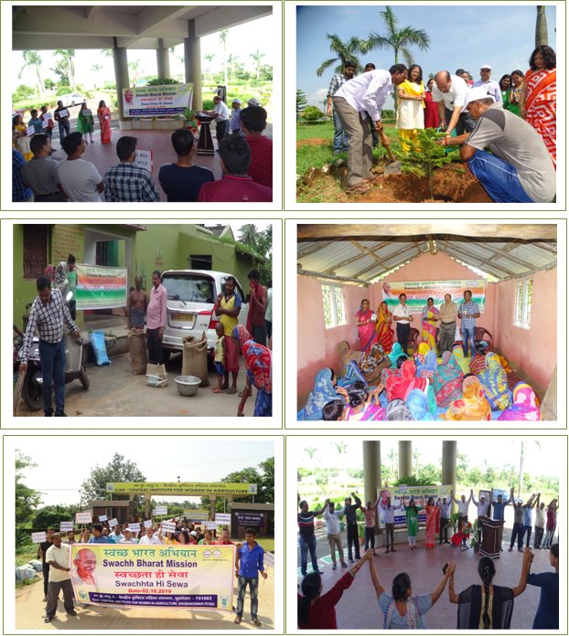 As part of the Swachhta campaign, a range of events were organized during Swachhata Hi Sewa celebrations during 11.09.2019 to 02.10.2019. Awareness programme on cleanliness drive especially phasing out of single use plastic by promoting sustainable alternatives and proper disposal of plastic waste was organized. The cleanliness campaign was carried out in different parts of the institute campus, residential areas, inside and outside as well as surroundings of office buildings involving all the regular and contractual staffs. Awareness was also made to replace single use plastic polythenes, PET bottles, cups, folders, artificial flowers, straws, cups, small bottles etc. Besides the programme in the institute, a Swachhata Hi Sewa programme was organized in village Bhodala, Cuttack; Nuasahi, Puri and Kharibil, Niali, Cuttack on 12.09.19 ;28.09.19 and 01.10.2019, respectively. About 465 people consisting of farm women, farmers, students, youth actively participated in the programme. The surroundings of office buildings, residential areas, experimental plots, orchards in institute and milk cooperative society, poultry farm, dairy farm, horticultural garden and approach roads of different villages were cleaned removing plastic items followed by dumping in a pit. This awareness programme was also propagated in adopted villages under MGMG, ongoing projects and AICRP, Home science centres across the country. The people were advised to shun the single use of plastic bags, pet bottles, cups to keep environment free of pollution during the 22 days programme. Mass campaigns on Swachhata Hi Sewa programme were also carried out in the villages to develop awareness among the people at grass root level.