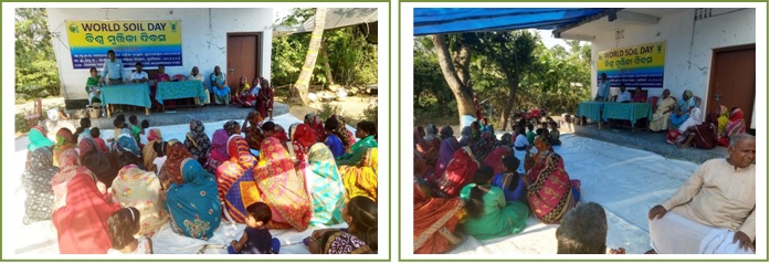 ICAR-Central Institute for Women in Agriculture, Bhubaneswar celebrated World Soil Health Day on 5th December, 2019 at village Kharibili of Niali Block, Cuttack District, Odisha where farmers are mostly involved in production of pulses like green gram, Black Gram, Arhar, Lathyrus, Horse Gram contributing for maintenance of soil health. Celebration of World Soil Health Day in this villages was a true recognition for their endeavour in keeping the soil alive over generations. It also motivated other farmers and farmwomen of the locality. The celebration was made under Mera Gaon, Mera Gaurav programme team II. In this programme more than 100 farm women participated. Mr Ramakanta Mohapatra, Ex- Sarpanch, Eranch Panchayat graced the programme as chief guest and emphasized on the importance of soil health and role of farmwomen in taking care of it. He also motivated the community for compost making as most of the villagers have livestock. He requested the gathering to take initiatives for integrated nutrient management. Dr Anil Kumar, Principal Scientist (LPM) and leader of ICAR-CIWA, MGMG II explained the gathering to cultivate hybrid napier grass in the derelict lands for soil conservation and more nutrition for the livestock. He also surveyed the livestock resources of the village for this purpose. Dr Sabita Mishra, Principal Scientist and member of MGMG Team II mobilized the farm women through innovative extension approaches for conservation of soil. Dr Laxmipriya Sahoo, seniolr Scientist and nodal officer for World Soil Day celebration, answered the gathering's queries on soil and farm and explained the remedial measures to recover less fertile soils. Sri Debendra Nath Sadangi, Technical Officer, Sri Manoranjan Prusty, Technical Officer and Ms Usharani Maradona, Technical Assistant managed the programme and explained the farmwomen on different aspects of pulse farming, Horticulture and fodder cultivation.