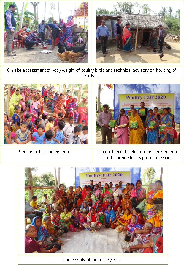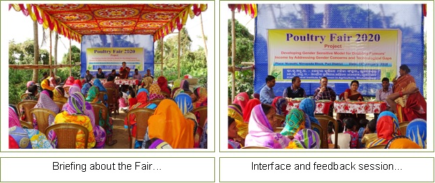 ''Poultry Fair 2020'' was organized under the project 'Developing gender sensitive model for doubling farmers’ income by addressing gender concerns and technological gaps' at Village Nuasahi in Puri district on 18 January, 2020. Dr. Jyoti Nayak, Principal Scientist briefed about the Fair, and also on health and nutrition of farmwomen and children. Dr. A.K. Panda, Principal Scientist delivered technical talk covering the subjects of housing, feeding, day-to-day management of poultry farm including vaccination, and taking up poultry farming in business mode. He also had interface with farmwomen and obtained their feedback on CIWA's technological interventions. Many farm women shared their success stories of poultry rearing and other technology adoption.