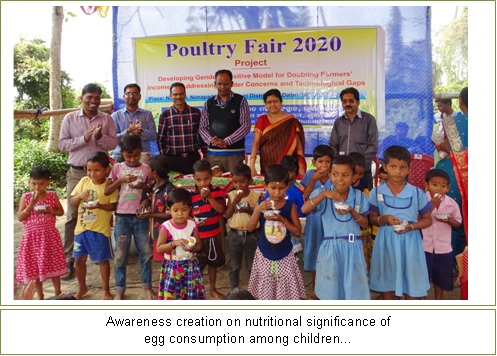 About 50 farm women who received the training earlier on improved poultry rearing practices on entrepreneurship mode for additional income generation, participated in the Fair, and displayed the birds. During earlier programmes, poultry chicks, feed, medicines for disease management and other infrastructural materials for poultry housing had been distributed to the participants. The poultry birds had attained an average body weight of 2 kgs at 12 weeks of age, and most of the women had sold male birds, earning an income of Rs. 5000/- from selling about 20 birds. On this occasion, awareness was created about the nutritional significance of egg consumption among farmwomen and children by distributing boiled eggs to them.