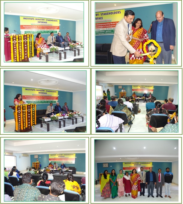 ICAR-Central Institute for Women in Agriculture, Bhubaneswar organized an Institute-Industry-Stakeholders Interface on "Development of Gender Sensitive Entrepreneurship Model through Institute-Industry-Stakeholders Linkage on Convergence Mode" under ICAR funded Extramural Project on 22 January, 2020. At the outset, Dr. Narendra Singh Rathore, Hon'ble VC, MPUAT, Udaipur and Former DDG (Agril. Education), ICAR, New Delhi graced the occasion as Chief Guest. Dr. Rathore during his presidential address emphasized the importance of such Interface meeting in bridging the gap between women farmers and entrepreneurship development. Dr. Lipi Das, Pr. Scientist and PI of the Project welcomed all the delegates and elaborated the purpose of the Interface and also presented the achievements under the above Project. The Director of the Institute, Dr. Santosh Kumar Srivastava, during his address emphasized the potential role of women farmers in bringing revolution in agriculture and allied sectors The programme was attended by personnel from various Govt. and private organizations viz., APICOL, OMFED, OFMRDC, Milk Mantra Dairy Industry, Kamal Enterprises, Art of Organic and Unicus Engineers Pvt. Ltd.; financial institution like NABARD; NGOs like NIGAM, PRADAN; Women Farmer Groups and Producer Organizations viz., Women group OMFED, Ananya Mahila Bikas Samiti, Paschimeswar WFPO and Women group ICARDA. The Interface offered opportunities for several stakeholders to share their experiences, success stories and constraints perceived in the journey of building up the enterprise. The developing women groups interested to initiate the venture in dairy, horticulture and farm implement based enterprise got first hand exposure in setting up their business. Such Interface meeting among all stakeholders enabled in paving the pathway towards development of a model: "A sustainable Gender Sensitive Entrepreneurship Model in dairy, horticulture and farm implement based enterprises in convergence mode". At the end Dr. B. Sahoo, Pr. Scientist and Co-PI of the project offered the vote of thanks.