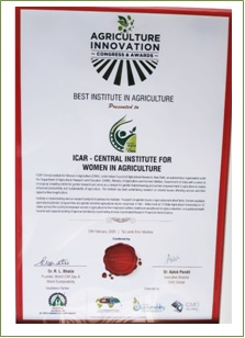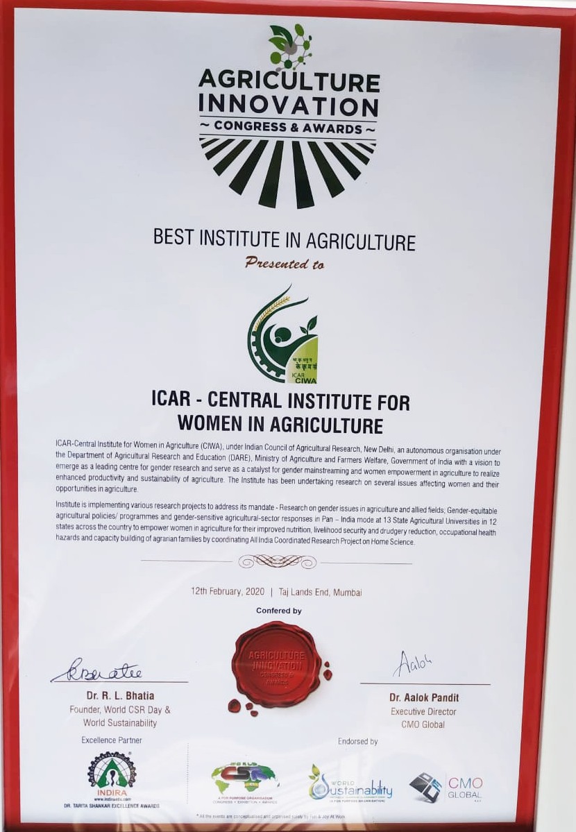 ICAR- Central Institute for Women in Agriculture bagged prestigious award “BEST INSTITUTE IN AGRICULTURE” by CMO Global (www.cmoglobal.org), CMO Asia (www.cmoasia.org) and World CSR Day (www.worldcsrday.com). Dr. S. K. Srivastava, Director, ICAR-CIWA Bhubaneswar received the award on behalf of the institute during an event held on 12th February, 2020 during Agriculture Innovation Congress & Awards at Taj Lands End, Mumbai.