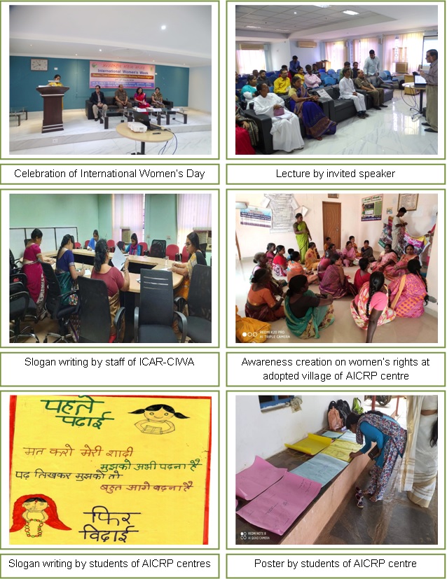 ICAR- Central Institute for Women in Agriculture (ICAR-CIWA), Bhubaneswar celebrated International Women's Day from 2nd March, 2020 to 8th March, 2020. On this occasion, several activities were conducted in ICAR-CIWA, Bhubaneswar as well as 13 centres of AICRP on Home Science spread across 12 states of India to create awareness on this year’s theme “I am Generation Equality: Realising Women’s Rights”.
