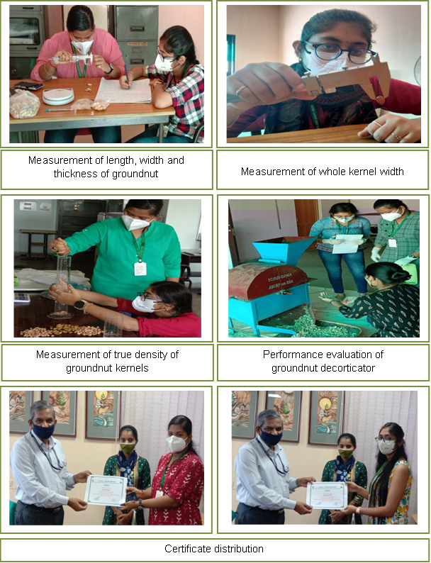 The trainee students attended lectures and undertook practicals in the field of agricultural engineering, machine design & ergonomics. They were introduced to role of woman in agriculture, agricultural statistics, occupational health hazard, design methodology of agricultural machinery, postural analysis techniques, human energy consumption, anthropometry etc. One project titled "Performance Evaluation of Groundnut Decorticator cum Stripper and Designing of Cleaning Screen" was designed and completed by the students. They applied the operational principles to evaluate the developed machinery. The students also benefitted by the hands on use of advanced ergonomics instrumentation and workshop machinery available at ICAR-CIWA. The students who completed summer in- plant training in Farm Machinery and Power were guided by the team of, Er. Chaitrali S. Mhatre, Scientist (FMP).