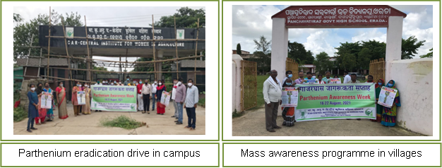 Parthenium awareness week was celebrated at ICAR-Central Institute for Women in Agriculture from 16th to 22nd August, 2021. A wide range of activities were conducted to spread maximum awareness among staff members, farm and campus workers as well as farm women in different project villages. The scientific and technical staff attended a lecture on "Parthenium weed problem and its management at the global level" by Dr. Steve W. Adkins, Professor of Plant Physiology, University of Queensland Australia on 16th August, 2021 on launching of Parthenium Awareness Week. All the staff members of the institute actively participated in Parthenium eradication drive by removing the weed present outside the institute. The ICAR-CIWA campus and Farm area are approaching to achieve Parthenium free campus. To spread the awareness in adopted villages on 21st August a programme was organised in Erada village in Jagatsinghpur village involving school children and farm women and mass awareness was done. All the programmes were organised as per the Govt. guidelines following COVID appropriate. The programme was coordinated by Dr. Praveen Jakhar, Nodal officer Parthenium Awareness Week