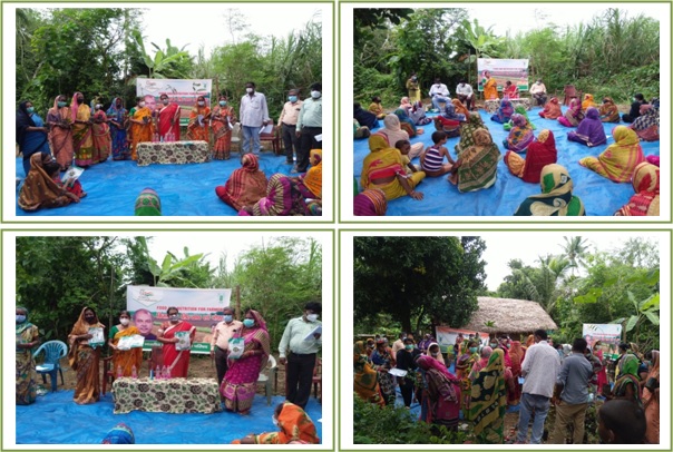 The ICAR-Central Institute for Women in Agriculture (ICAR-CIWA) has organized the National level Campaign on “Food and Nutrition for Farmers” on the auspicious occasion of "Azadi Ka Amrut Mahostsav" on 26.8.2021 at Guapur village of Balipatna block under Khordha district of Odisha. On the event, the team sensitized the farm women regarding importance of celebration of 'Ajadi Ka Amrut Mahostsav' in the eve of 75 years of Indepence of India. During dialogue, the scientists highlighted the contribution and hard work of farm women in agriculture and the magnitude of food and nutritional security. In addition, the farm women were well-informed about the significance of vitamins, minerals, carbohydrate, protein, fat, etc. for their health. Tips were given to consume the balanced food in their daily diets followed by care of pregnant mothers, adolescent girls and new born babies. The farm women were also advised to take locally available vitamine rich fruits and vegetables. Created awreness to develop poultry units, mushroom, nutrition garden, etc. in their homesteads for easy availability nutrients. About 60 farm women had participated in the programme. At the end, the vegetable seeds (brinjal, cucumber, pumpkin, tomato, bean, spinach) and seedlings (mango, guava, lemon, drumstick) were distributed as critical inputs to grow in their backyards. The programme was coordinated by Dr. Sabita Mishra, Dr. L. P. Sahoo and Shri B. C. Behera of the institute.