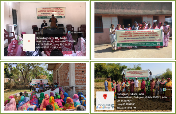 Two capacity building programmes were organized on 14th and 15th February 2022 in Harichandanpur and Aanadpur blocks of Keonjhar district under the OIIPCRA project titled “Empowering farm women through climate smart intensification and diversification in minor irrigation command areas of Keonjhar District (Odisha)”. The first capacity building programme titled “Production enhancement of sunflower through good agricultural practices (GAP)” was at Jamujodi village under Jamujodi MIP command area in Harichandanpur block. The programme was attended by Mrs. Manjulata Nayak, (Agriculture Overseer, Harichandanpur), Sh. Siba Nayak, (Shrishti NGO) and other line department officials. Fifty farm women participated in the programme. Talk on good agricultural practice ie. Precision nutrient management in sunflower for higher oil yield was delivered by Dr. Praveen Jakhar, PI (OIIPCRA project). Mrs. Manjulata Nayak emphasized on critical measures for higher water productivity under climate stress. measures for drudgery reduction for farm women in sunflower cultivation was delivered by Dr. Dr. Sachidananda Swain, Co-PI (OIIPCRA project). This was followed by field visit for demonstration of the GAPs.