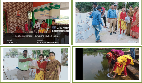 A Front Line Demonstration on “Composite Fish Farming” was organized on 23 February 2022 at Village Kanjia, Satyabadi Block, Puri District adopted under Institute project “Development of nutri smart villages for food security and dietary diversity for combating malnutrition” by ICAR- Central Institute for Women in Agriculture, Bhubaneswar. During the programme, 25000 numbers of Indian Major Carp fingerlings procured from National Fresh water Fish Brood Bank, Bhubaneswar were distributed to the 25 homestead pond holders. The programme was co-ordinated by Dr Jyoti Nayak, Dr Tanuja S and Er. Subart Kumar Das. Dr Jyoti Nayak explained about the pertinence of the project in eradicating malnutrition and improving nutritional and food security of farm families. She stressed on the importance of proper nutrition of adolescent girls and pregnant women. Dr Tanuja S detailed about the water quality management after stocking of fish fingerlings. The farmers were also made aware of the importance of supplementary feeding for obtaining proper growth and yield. A demonstration on the proper stocking method of fish fingerlings was done by the ICAR-CIWA team during the programme. The programme was attended by 50 farmers and farmwomen.