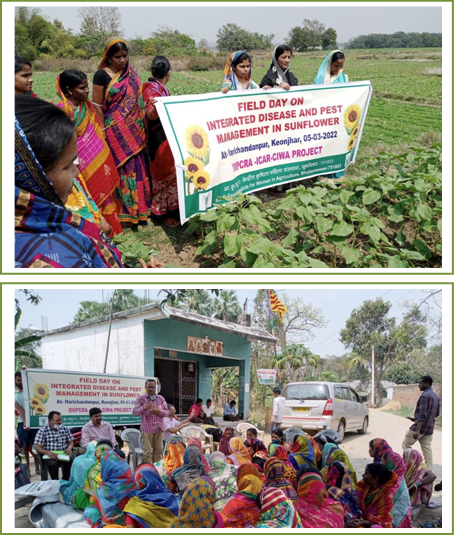 A Field Day was organized on 5th March 2022 in Jamujodi village of Harichandanpur block of Keonjhar district under the ICAR-CIWA-OIIPCRA project titled “Empowering farm women through climate smart intensification and diversification in minor irrigation command areas of Keonjhar District (Odisha)”. The programme titled “Integrated Disease and Pest management” was organized monitoring of demonstration trials and suggestive technological interventions in fields under Jamujodi MIP command area in Harichandanpur block. The programme was attended by Mrs. Manjulata Nayak, (Agriculture Overseer, Harichandanpur), Sh. Kalindi Pradhan, (Agriculture Overseer, Harichandanpur), Dr. Mihir Mahapatra (Nodal, ADI-OIIPCRA) and Sh. Sanjay Mahapatra, ADO, Ghatgaon, Keonjhar. Fifty farm women having sunflower crop demonstration trials in their field participated in the programme. Dr. Praveen Jakhar, PI (OIIPCRA project) presented an overview on the importance of technological interventions at critical stages of crop. Dr. Mihir Mahapatra highlighted the importance of bio control in pest management. Sh. Sanjay Mahapatra, emphasized on integrated measures for higher sunflower productivity under biotic stress. This was followed by field visit for monitoring of demonstration plots of farm women. Dr. Sachidananda Swain, Co-PI (OIIPCRA project) demonstration the use of different gender friendly tools for pest management. The programme was coordinated Dr. Praveen Jakhar and Dr. Sachidananda Swain. The progress of the ICAR-CIWA-OIIPCRA project for Rabi-2022 was also presented to BAO, Harichandanpur and other department officials.