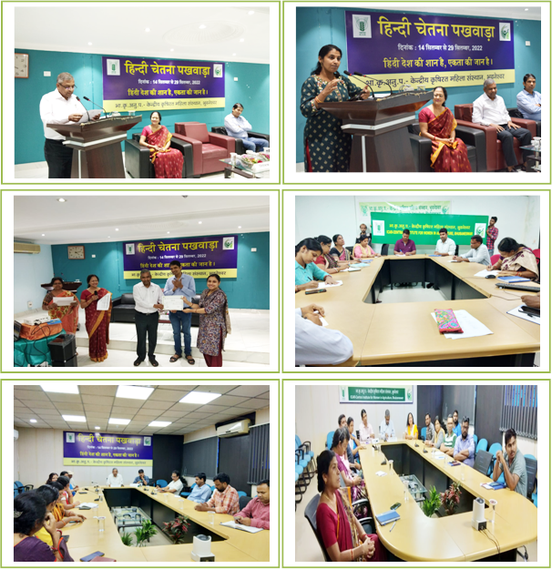 केन्द्रीय कृषिरत महिला संस्थान में हिन्दी चेतना पखवाड़ा कार्यक्रम का शुभारंभ समारोह डा. अनिल कुमार, निदेशक महोदय की अध्यक्षता में दिनांक 14 सितमबर 2022 को आयोजित किया गया । इस कार्यक्रम को आरंभ करते हुए श्रीमती परिसीमासेन, निजी सचिव, ने मुख्य अतिथि निदेशक महोदय समेत संस्थान के सभी कर्मचारियों का स्वागत किया । अपने संदेश में निदेशक महोदय ने हिन्दी की सराहना की और कैसे हिन्दी दुनिया में सब से अधिक बोले जाने वाली भाषाओं में से एक है बताया और बताया की कैसे हिन्दी एक सूत्र से हमारे देश को बांधे रखने में अहम भूमिका निभाती है । हिन्दी एक जोड़ने वाली भाषा के रूप में अपना एक अलग पहचान बनाने में कामयाब रही है । हिन्दी चेतना पखवाड़े के दौरान ज्यादा से ज्यादा दैनिक कार्य हिन्दी में करने के लिए सभी कर्मचारियों से अनुरोध किए । निदेशक महोदय के वक्तव्य के बाद उपस्थित कर्मचारियों में भी भिन्न भिन्न माध्यम से हिन्दी के प्रति अपनी लगाव को व्यक्त किया । अंत में श्री. अतुल चेतन हेमरोम ने धन्यवाद ज्ञापन कर कार्यक्रम का अंत किया ।
