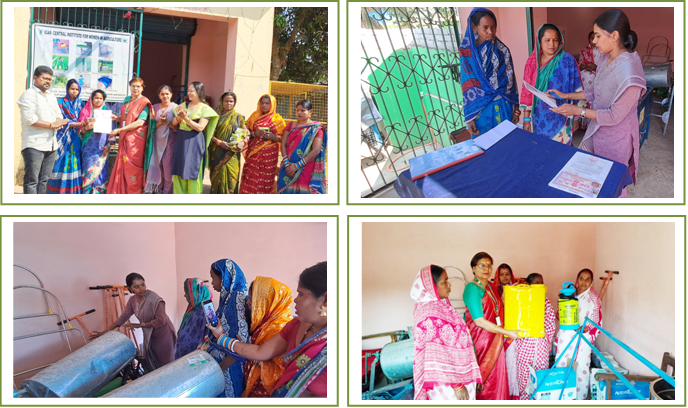 There is a paradigm shift in the Indian agricultural scenario. More number of operations are being done with improved tools and machines; manual or powered. Custom hiring centres make farm machinery and equipments available to women, small and marginal farmers at affordable hire. Formulation of an SHG by women to establish a Custom hiring centre is successful way to ensure women farmers are equal beneficiaries of growing mechanization in agricultural sector of India.The village of Kunjar is located in the Pipili Block of Puri district. Multiple crops are cultivated during the year such as paddy, green gram, vegetables etc. Most of the agricultural operations are performed manually. Hence a Custom Hiring Centre of women friendly tools was established through funding from the SCSP scheme for economic benefits and overall socio-economic upliftment of the women of the village. The MoA for the CHC was signed between ICAR-CIWA, Bhubaneswar and NAGESWARI Women Self Help Group, Kunjar, Pipili block of Puri district Odisha for the management of the CHC at village level. Dr. Mridula Devi, Director ICAR-CIWA, encouraged the women emphasising the need to adopt advanced tools, technologies & machinery. She insisted that this custom hiring centre must be used by the farm women regularly and judiciously for the betterment of the community. Dr. Jyoti Nayak, Pr. Scientist, ICAR-CIWA inspired the farm women to work in collaboration and highlighted the benefits of custom hiring centre. Er. Chaitrali Mhatre, Scientist, ICAR-CIWA demonstrated the usage of tools and equipment which were given in the custom hiring centre. These tools and equipments were chosen after careful study of the village’s cropping pattern and involvement of women in various agricultural activities under her institute project. The successful establishment of Custom Hiring Centre in Kunjar village was co-ordinated by, Er. Chaitrali Mhatre, Dr. Jyoti Nayak, Mrs. Geeta Saha & Er. Monalisa Pati.