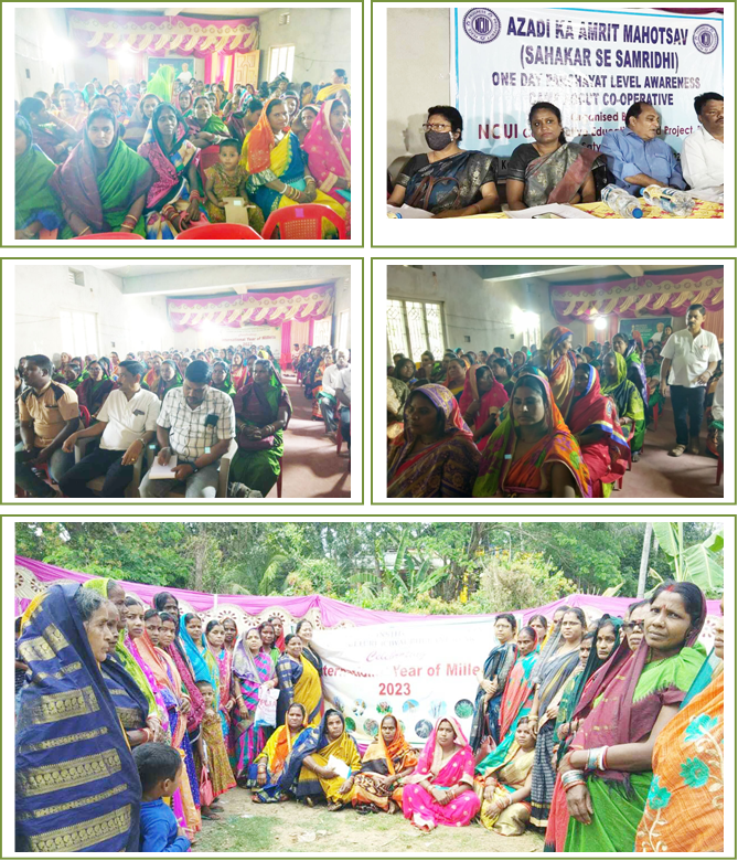 The ICAR-Central Institute for Women in Agriculture (ICAR-CIWA) organized an awareness programme in Collaboration with National Cooperative Union of India Cooperative Education; Puri at Kadua village on 22.3.2023. 200 farmwomen from different SHGs participated in the programme. Smt Subhashree Swain project Officer welcomed the dignitaries and participants. The Chief Guest, Sri Sunil kumar Panda, Chairman, Satyabadi Block emphasized the importance of Cooperative Societies in the economic development of India and cited the contribution of ICAR-CIWA in the socio economic up-liftment of farmwomen of Kadua Panchayat by providing skill training and inputs. The Chief Speaker Sri Brahmananda Parida, Secy,OSCU, Bhubaneswar, pointed out the cooperatives societies engaged, particularly, in the rural based sector such as agriculture, fishery, agro processing, dairy are providing credit, agricultural inputs and marketing for milk, fish, vegetable, fruits, forest products etc .Dr Jyoti Nayak, Principal Scientist emphasized that SHGs to keep a strong linkage with the cooperative society for marketing of their products and cited that we are celebrating 2023 as International year of Millets to include millets in their diet. Mrs. Geeta Saha, technical officer, discussed about the various activities of ICAR-CIWA.The programme was ended with the vote of thanks by Sri A.R Pattnaik, CEI.