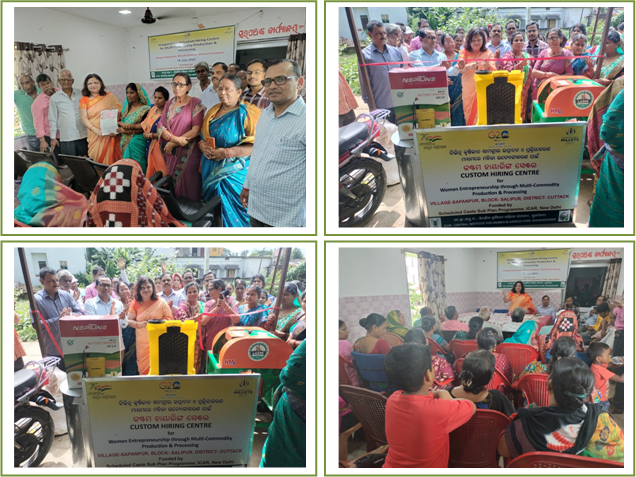The promotion of women entrepreneurship programme was taken up in Satyabhamapur village of Salipur block under Cuttack District through establishment of Custom Hiring Centre (CHC).Under the Banner of Azadi ka Amrit Mahotsav, the inauguration of a Custom Hiring Centre was organized on 18 July 2023 with Baba Trinath SHG (WSHG) of Nirmalya FPO under Scheduled Caste Sub Plan (SCSP) program. The key objective for establishing the CHCs is to enrich the women entrepreneurs through various machineries, tools and implements provided to them through ICAR-CIWA. It further aims to promote positive attitude towards entrepreneurship among the farming community especially among women farmers. The machineries, tools and other implements provided will enrich the knowledge and motivate the women farmers to take up various production and processing activities like preparation of spices, its packaging, value addition etc. It will also enhance the earning capability by renting the machineries for flour making, rice mill, chaff cutter, power weeder, etc. The women involved in various agro-based activities under the CHC will be able to attain economic stability, acquired skill set for operating the machineries leading them to social mainstream. It will enable them to be self-reliant (Atmanirbhar) and self-sufficient. The Line departments personnel were also attended the program and assured for full cooperation and support to the women farmers. The marketing of processed products will also be provided with necessary support from the concerned line departments with maintenance of quality of the products and the packaging which will help them to export the produces to other places. Dr. Lipi Das Principal Scientist ICAR-CIWA briefly spoke about the concept of Custom Hiring Centre, the innovative approach for bringing Socio-Techno-Economic changes among the women farmers. Dr. Bishwanath Sahoo, Principal Scientist ICAR-CIWA emphasized on increased cattle count in the village and shared about the benefits of scientific feeding of cattles. The programme was coordinated by Shri Suresh Kumar Tripathy, Secretary, Nigam NGO. The programme was also attended by Sarpanch, District Agril. Officer, Veterinary Officer, other Line Department Personnel, Staff of Nigam NGO, Members of Baba Trinath SHG, staff of ICAR-CIWA Mr. Atul Chetan Hemrom and they gave their support and enlightened the participating women farmers. The program ended with a vote of thanks by Smt. Snehalata Singh, Chairman of Nirmalya FPO. The programme was attended by more than 70 women farmers and other line department personnel.