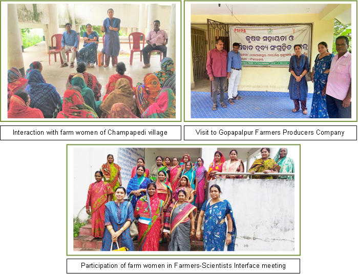 A Farmers-Scientists Interface meeting was organized at Champapedi village in Ranapur block of Nayagarh district on 16 August 2023 for Development of Horticulture (Fruits)-based Organic Farming Model for Farm Women. The interface meeting was organized to create awareness among the farm women about the importance of organic farming and to make them responsive about the income earning opportunities through sustainable organic farming models. The women group was sensitized about the significance of organic farming in achieving self-sufficiency and sustainability in agricultural production through organic approaches. The cropping pattern of the village along with the potential horticultural crops of the region viz., papaya, mango, tomato, cauliflower, cucurbits was discussed along with their cultural practices pertaining to nutrient management, pest and disease management. The meeting was attended by 55 farm women of Champapedi village. While interaction, the issues, constraints and needs of farm women in organic farming were identified and the women group was encouraged for formation of Farmers-Interest group to establish a ‘Bio-resource production unit’ at their village. The market opportunities were also explored in the region and ‘Gopalpur FPC’ was identified as a potential stakeholder to provide the initial marketing support to the women group to sell the bio-inputs of their bio-resource production unit. The interface meeting was also attended by Mr. Ratnakar Nishanka, CEO of Gopalpur FPC, who expressed his interest in supporting the marketing requisite of the bio-inputs produced by the women group. The meeting was successfully organized by Dr. Ankita Sahu, Scientist & PI, Dr. L.P. Sahoo, Senior Scientist & Co-PI and Mr. M.R. Prusty, Senior Technical Officer.