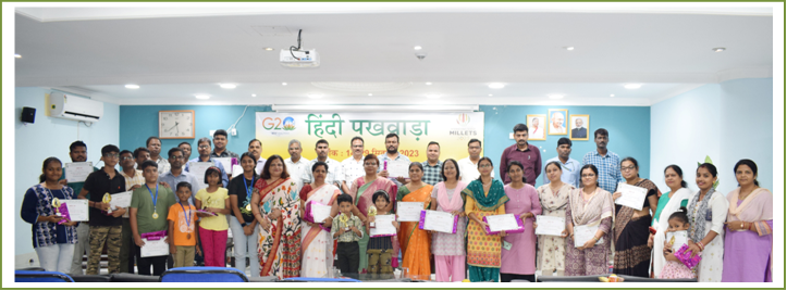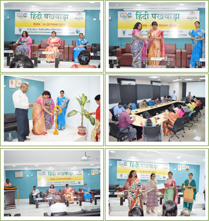 दिनांक 14 सितंबर 2023 को भा. कृ. अनु. प. – केन्द्रीय कृषिरत महिला संस्थान, भुवनेश्वर में हिन्दी दिवस के शुभारंभ समारोह के साथ ही हिन्दी पखवाड़ा 14-29 सितंबर 2023 तक आयोजित किया गया। कार्यक्रम का शुभारंभ निदेशक महोदया श्रीमती डॅा. मृदुला देवी, डॅा लिपि दास एवं अन्य गणमान्यों द्वारा दीप प्रज्वलन कर किया गया। सर्वप्रथम डॅा. लिपि दास, अध्यक्ष हिंदी दिवस के शुभ अवसर पर सभी का अभिनंदन किया और अपने छोटे वक्तव्य में हिन्दी को राजभाषा का दर्जा मिलने के महत्व पर प्रकाश डाला और बताया की आजादी के दो साल बाद 14 सितंबर 1949 के दिन हिन्दी को राज भाषा घोषित किया गया था। उन्होंने सारे कर्मचारियों को हिन्दी पखवाड़े के दौरान सारे आयोजित कार्यक्रमों में बढ़ चढ़ के हिस्सा लेने की सलाह दी। तत्पश्चात मुख्य अतिथि निदेशक महोदया द्वारा अपने संवाद में हिन्दी की महत्वपूर्णता, क्षमता एवं एक राजभाषा हो कर इसके उद्देश्य को प्रत्यक्ष रूप से प्रस्तुत कर बताया के किस प्रकार से विविधताओं से बटें हुए अपने देश को हिन्दी कैसे एक जुट रखे हुए है। उन्होने कार्यालय में हिन्दी के अधिकाधिक प्रयोग की अपील की।
