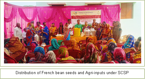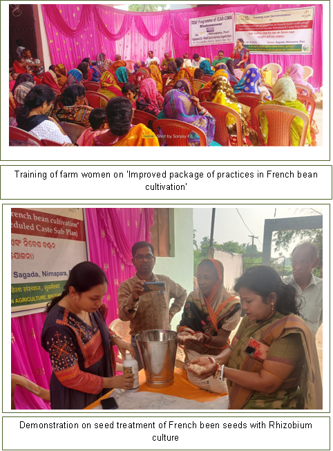 In preparation for the forthcoming Rabi season cultivation, ICAR-Central Institute for Women in Agriculture, Bhubaneswar conducted a Training and Demonstration program focused on ‘Improved package of practices in French bean cultivation’ in Sagada village, located within the Nimapara block of Puri on 18th October 2023. The programme comprised of demonstration on seed treatment of French been seeds with Rhizobium culture to promote nitrogen fixation in the root nodules of the plants for increased nitrogen availability and improved plant growth. The women farmers were provided hands-on training on seed treatment techniques using Rhizobium culture. The training programme provided the farm women a holistic awareness on improved package of practices of French bean cultivation comprising of land preparation, soil analysis, adjusting soil pH, application of manures and basal dose of fertilizers, intercultural operations viz., weed control, mulching, thinning, and pinching; crop management viz., Integrated Nutrient Management, Irrigation Management, Integrated Disease and Pest Management; harvesting techniques, post-harvest handling. Considering the ample time availability with the farm women, post-paddy harvesting, Family-Poultry was popularized as an approach towards income diversification and livelihood improvement. Popularization of Family-Poultry in rural areas among SC farm women is a promising source of additional income due to low initial capital investment, easy income generation and a source of nutrition. In this training programme, the farm women were trained on several key components that contribute to the successful management of a small-scale poultry operation viz., selection of appropriate poultry breeds, suitable housing and shelter, feeding and nutrition, egg production and management, meat production, managing poultry waste and market access. Additionally, on this occasion critical inputs viz., sprayer, iron bucket, showel, milk can and improved hand sickle (each 60 nos.) were distributed to 60 SC women farmers. To commence the rabi cultivation, superior quality French bean seeds (cv. Arka Arjun) 50 Kg were also distributed among 60 progressive farm women to demonstrate in their nutri-garden covering an area of 2.5 acres. The farm women were also sensitized about the importance of farm mechanization in agriculture and use of small tools and implements to reduce drudgery. The programme was successfully coordinated by Dr. Ankita Sahu, Scientist, Dr. A.K. Panda, Principal Scientist with the technical assistance of Mr. S.K. Behera, Senior Technical Assistant, ICAR-CIWA.