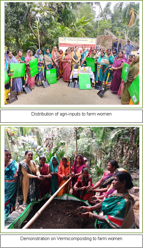 Training cum demonstration on “Vermicomposting” was organized by ICAR-Central Institute for Women in Agriculture, Bhubaneswar at village Dhanahara in Balipatna block of Khordha district of Odisha on 5 December 2023. In this programme, the technique of Vermicomposting was popularized among 70 SC farm women of 3 villages viz., Sodhua, Dhanahara and Majhihara of Balipatna block of Khordha. The officials from line department and NGOs actively participated in the progrmamme. The participating women farmers received hands-on training in establishing vermi-beds, preparing bedding, and layering compost for introducing earthworms into the vermi-beds. As part of the initiative to ensure widespread adoption of the technology, 75 High-Density Polyethylene (HDPE) vermi-beds were distributed among the 70 farm women, enabling large-scale production of vermicompost (approx. 150 tonnes annually). Moreover, a strategic plan was devised to encourage the entrepreneurship of women groups by branding, packaging, and establishing market linkages for vermicompost production. The training aimed to empower the farm women of the region to set up small-scale vermicompost production units in their homestead areas, aligning with the activities of development of Horticulture (Fruits)-based Organic Farming Model for Entrepreneurship and Strengthening Self-Reliance (Atmanirbhar) among Farm Women." On this occasion other critical inputs such as vegetable seeds (French bean var. Arka Arjun, 50 kgs), drudgery reducing tools like improved sickle (70 nos.), shovel (60 nos.), wheel barrow (10 nos.) and plastic jerry can (40 nos.) etc. were also distributed to supplement their rabi cultivation. The women farmers were also sensitized about the soil health, emphasizing the importance of soil testing. A demonstration on the process of collecting a representative soil sample from the field was also conducted. The farm women were educated about the process of recycling of farm waste for sustainable agriculture production as well as green house gases mitigation. The women farmers gained an understanding on the importance of soil testing, recycling farm waste into vermicomposting and natural farming for long term benefits. The programme was successfully organized by Dr. Ankita Sahu, Scientist and Dr. L.P. Sahoo, Senior Scientist from ICAR-CIWA.