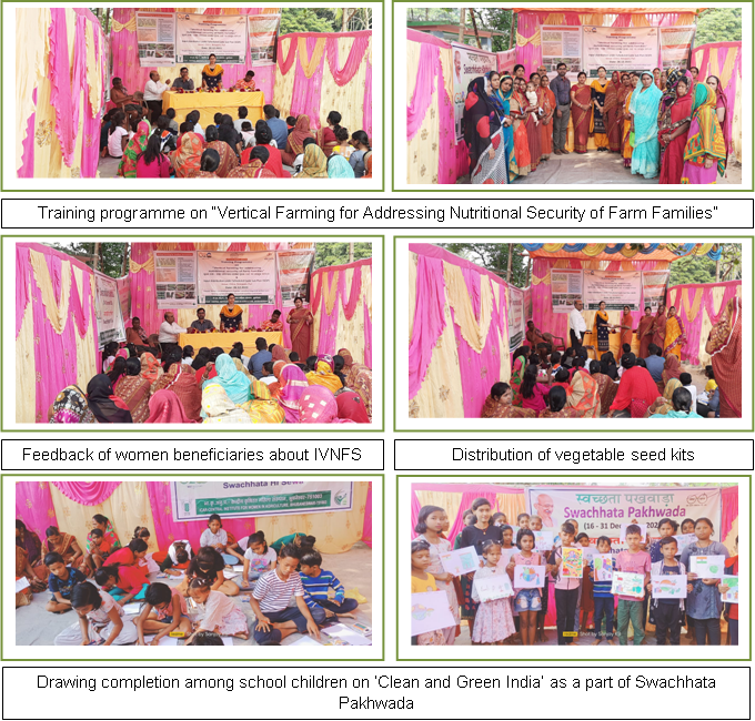 ICAR-Central Institute for Women in Agriculture, Bhubaneswar organized a one day training programme on “Vertical Farming for Addressing Nutritional Security of Farm Families” at Chitra village of Nimapara Block of Puri District of Odisha on 26 December 2023. During this training programme, the importance of vertical farming in the present context was highlighted and different techniques of vertical farming were popularized among the women farmers. The farmwomen were sensitized and trained about sustainable vertical farming ventures like integrated cultivation of vegetables along with mushroom and poultry in the Integrated Vertical Nutri-Farming System (IVNFS), cultivation of vegetables, herbs and strawberries in vertical trellis, hydroponic fodder cultivation, mushroom and poultry production and microgreens cultivation etc. These women-friendly techniques can be easily adopted by landless women farmers for ensuring regular availability of different nutri-rich produce from their house premises without much drudgery. About 50 farmwomen were participated in the programme. Farmwomen expressed their satisfaction about the IVNFS. They stated that they were getting regular availability of vegetables, mushroom and eggs from the IVNFS and were avoiding market-sourced vegetables, which helps them in saving of money and at the same time they were getting some income from selling of surplus produces obtained from the IVNFS. At the end of the programme, vegetable seed kits consisting of five seasonal vegetables (French bean, Radish, Palak, Coriander and Amaranthus) were distributed to each 35 selected SC farmwomen beneficiaries under the Scheduled Caste Sub Plan (SCSP) programme. As a part of Swachhata Pakhwada a drawing completion among 30 school children was also organized in which the participants express their creative talents while fostering an appreciation for the clean and green India. The programme was coordinated by Dr. Tania Seth, Scientist and assisted by Mr. Sanjay Kumar Behera, Senior Technical Assistant of the institute.