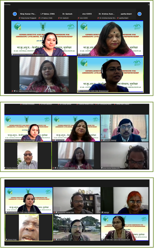 ICAR-Central Institute for Women in Agriculture, Bhubaneswar in collaboration with MANAGE, Hyderabad organized an on-line collaborative Training Programme on “Gender-Sensitive Agri-Horti based Dimensions for addressing Livelihood, Nutrition and Entrepreneurship” during 15-19 January, 2024. The training programme was intended to enhance the knowledge and skill of extension functionaries on gender sensitive approaches and technologies in agriculture and horticulture sectors for improving livelihood, enhancing nutrition and promoting agri-preneurship among rural farm women. The training encompassed lectures from five major domains, viz., Gender-sensitive and gender-centric extension approaches in disseminating agri-horti technologies among farm women; Innovative production technologies in agricultural and horticultural crops for enhanced productivity and profitability; Nutri-sensitive agri-horti technologies, farming models, value addition for enhancing family nutrition; Secondary agriculture and value addition in agriculture and horticulture sectors for entrepreneurship development among farm women and Agripreneurship promotion through formation of Farmers Producers Organizations (FPOs), multi-stakeholder convergence, market and industrial linkages. The training comprised of 20 lectures including 8 lectures from Guest Experts from various ICAR organizations, viz., IARI, New Delhi; IIHR, Bengaluru; CISH, Lucknow; CIFE, Mumbai, NAARM, Hyderabad; IIWM, Bhubaneswar and MANAGE, Hyderabad.