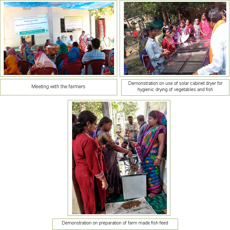 A demonstration on farm made fish feed preparation and hygienic solar drying was organized by ICAR-CIWA Bhubaneswar at Narakoligoroda Village, Satyabadi Blcok, Puri District on 28 February 2024 under the NICRA funded project on “Gender responsive Integrated Homestead Aqua-horticulture (GRIHA): A Sustainable Climate Resilient Approach towards Livelihood Diversification’’. The project was implemented by ICAR-CIWA with an aim to ensure sustainable production and availability of nutritious fish and vegetable to rural families, through popularization of climate smart and women friendly aqua-horticulture practices. Around 60 farmers actively participated in the programme. The farmers were demonstrated the preparation of fish feed with locally available feed ingredients using a pelleting machine. The use of cost-effective farm made feed formulations that are palatable and having a nutrient composition that targets the specific developmental stage of the fish will improve production parameters, improve the economic efficiency of the aquaculture operations, and will have a positive effect on the environmental impact of the farming operations. Hygienic drying of vegetables and fish using solar cabinet dryer was also demonstrated to the farmers.. The programme was co-ordinated by Dr Tanuja S, Sr. Scientist and Dr Sukanta Kumar Sarangi, Head, Division of Agricultural Technologies for Women, ICAR-CIWA Bhubaneswar