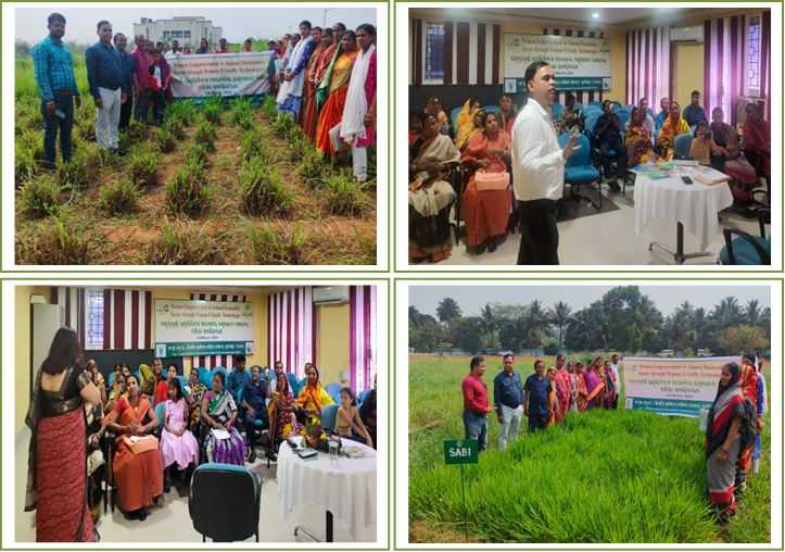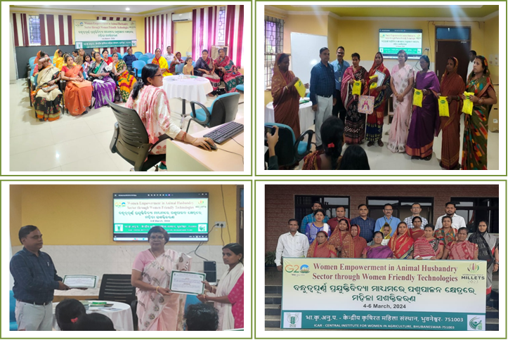 ICAR- Central Institute for Women in Agriculture, Bhubaneswar organized a skill based capacity building pogramme on "Women Empowerment in Animal Husbandry sector through Women Friendly Technologies" in the Institute Campus during 04-06 March 24. The importance of women friendly technologies in Animal husbandry sector, adoption of latest technologies with women friendly interventions were highlighted during the programme. Several issues and approaches related to role of women in livestock production, livelihood improvement and nutritional security of farm women through dairy, goatery,Poultry and Duckery, empowering farm women through small ruminant and dairy farming, fodder cultivation and conservation along with opportunities for farm women in organized dairy sector were thoroughly discussed among the participants for improving the livelihood security of farm women. The farm women were explained different farm activities and models developed in livestock sector, enhancing profitability through integrated farming system (SAS model). Practical demonstration and hands on training was imparted to 26 participants (19 women and 7 men) on preparation of balanced ration, chaffing of fodder through machine operated chaff cutter, vaccination of poultry and goats, health care, housing and management of animals and birds during the training programme. During the valedictory function, Dr. Mridula Devi, Director of ICAR-CIWA interacted with all the participants about the impact of the training programme and urged the progressive farm women to implement the women friendly technologies at the grass root level and distributed the certificates to the participants. The programme was coordinated by Dr B. Sahoo and Dr A.K. Panda, ICAR-CIWA, Bhubaneswar.