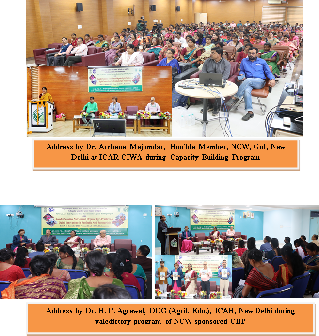 | Dr. R. C. Agrawal, Deputy Director General (Agril. Edu.), ICAR, New Delhi, Chaired the valedictory function and delivering presidential address on 11 December 2024. He emphasized the pivotal role of ICAR-CIWA in fostering agri-preneurship through the value addition of agricultural produces. He stressed on the relevance of such training programs in both personal and professional settings. Hon’ble DDG also suggested that ICAR-CIWA should take initiative in innovative packaging and online marketing of value added products prepared by the entrepreneurs. Mrs. Bijaya Barwa, Retd. Additional S.P, Govt. of Odisha, Guests of Honour of the program highlighted that the safety and security of women and children in the country is the utmost priority. She also sensitized the participants that through Cyber Crime Helpline the victims can get immediate assistance against online financial fraud. |
