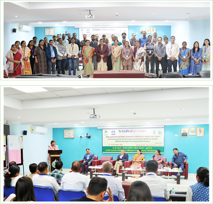 | A three-days residential training programme, sponsored by the Bankers Institute of Rural Development (BIRD), Lucknow (Uttar Pradesh) was organized jointly by the ICAR-Central Institute for Women in Agriculture (CIWA), Bhubaneswar and the Centre for Climate Change, BIRD, Lucknow during 27-29 November 2024. The main theme of the training was ‘Environmental and Social Impact Assessment (ESIA) and Gender Mainstreaming in Development Projects’. The aim of the programme was to familiarize participants with various R&D-oriented initiatives for women’s empowerment undertaken by ICAR-CIWA and to equip them with the skills to assess and analyze the impact of developmental projects which are both environmentally sustainable and socially inclusive. About 33 participants from different states such as Uttar Pradesh, Uttarakhand, Jharkhand, Rajasthan, Haryana, Gujarat and Odisha participated in this training. This training emphasized the integration of gender issues while conceptualizing or in developing new projects. Technical sessions were based on tools and methods in ESIA, overview of environmental and social safeguard framework & performance standards which were coordinated by Dr Snehal M Bansod and Dr Rajni Pandey, Programme Directors, BIRD, Lucknow through participatory approach by group discussion, presentations etc. A Session on ‘Increasing role of Women in Agriculture: Challenges and Opportunities’ was delivered by Dr Mridula Devi, Hon’ble Director, ICAR-CIWA, Bhubaneswar. During the programme, visits were organised to the laboratories and farms of ICAR-CIWA, Krishi Vigyan Kendra, Puri and adopted village of ICAR-CIWA for gaining the practical insight and awareness about different women friendly technologies and farming system models. During the valedictory ceremony, the Chief General Manager NABARD Dr S.K. Mishra was the Chief Guest and AGM Dr Samir R Samantra, Gust of Honour graced the occasion and distributed the Certificates to the participants in the presence of Dr Mridula Devi, Director, ICAR-CIWA, Bhubaneswar. |
