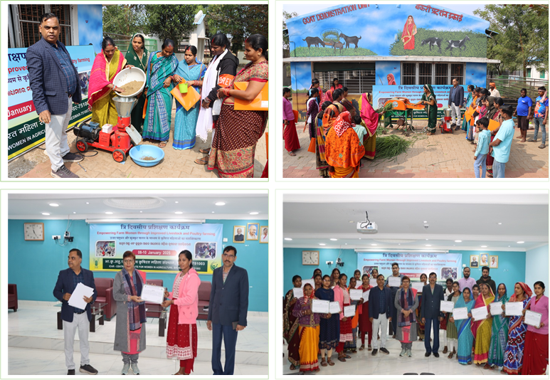 | The ICAR- Central Institute for Women in Agriculture, Bhubaneswar organized a three day training programme on “Empowering Farm women through Improved Livestock and Poultry farming” through Custom Hiring Centre (CHC) during 08-10 January 2025 under Scheduled Caste Sub Plan Programme. The aim of the training programme was to aware about improved scientific technologies to farm women in Animal Husbandry sector like dairy, goatery, poultry etc. The training programme was a kind of foundation programme to make the women aware about concept of CHC and how to manage it to get maximum benefit by use of tools and machineries. A series of lectures were delivered to transfer technical knowhow in livestock sector to the trainees in three day training programme. During the training programme, Dr Mridula Devi, Director, ICAR CIWA detailed the ongoing activities of this unique institution highlighting the objective and mission of ICAR-CIWA and importance women led Custom Hiring Centre (CHC) working in animal husbandry sector for the benefit of farm women. During the three day training, scientists of the institute shared knowledge and experience to integrate with CHC for entrepreneurship development. Dr. Arun Kumar Panda, Head, Division of Gender Family and Community Studies, Dr B. Sahoo, Pr. Scientist and Dr. Arpita Mohapatra, Scientist demonstrated various tools, models and animal husbandry practices for improved dairy, goatery and poultry farming. Dr. S.K.Sarangi, Head, Division of Agricultural Technologies for Women, ICAR-CIWA led the dissemination of technologies related to agriculture and allied sectors especially, Potato cultivation, food processing, nutri garden, farm machinery, fishery. A total of 26 participants, consisting of both men and women, actively participated in the training programme and were awarded certificates by the Director, ICAR-CIWA, upon successful completion of the programme. The training was coordinated by Dr. B. Sahoo, Principal Scientist (Animal Science), ICAR-CIWA |