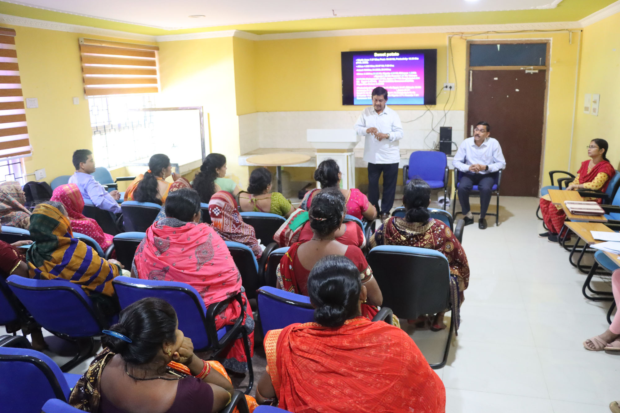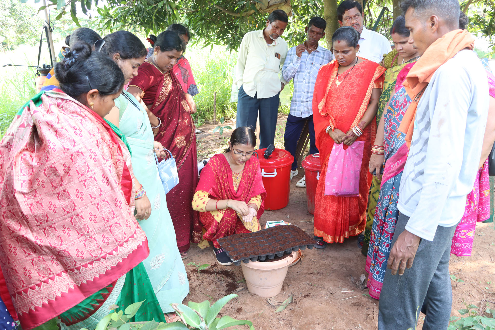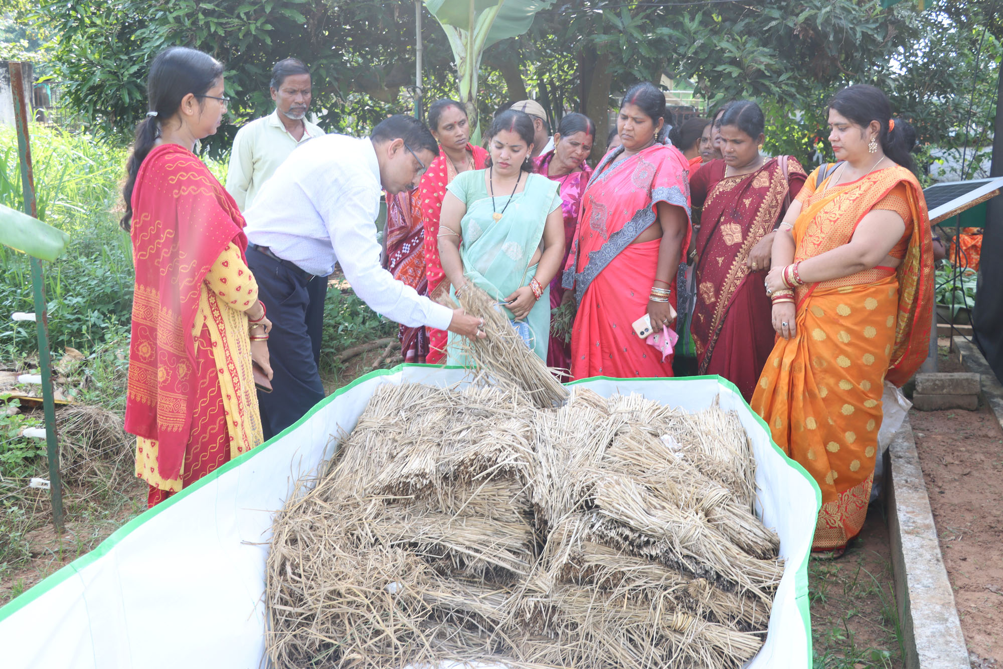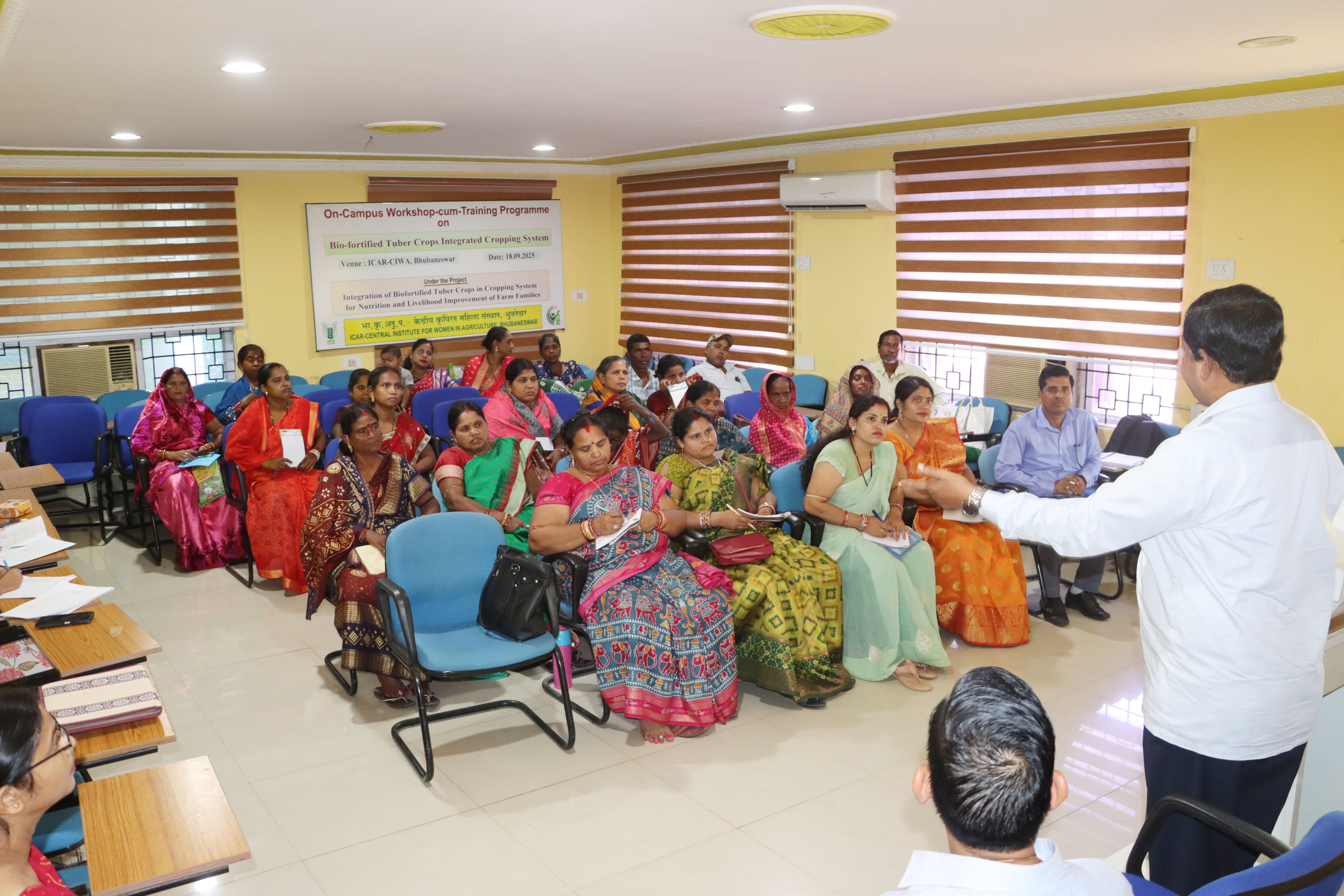 | A Workshop-cum-Training Programme on “Bio-fortified Tuber Crops Integrated Cropping System” was organized at ICAR-Central Institute for Women in Agriculture, Bhubaneswar on 18 September, 2025. Dr. Tania Seth, Scientist welcomed all the participants and described the purpose and objectives of the workshop. She emphasized the importance of bio-fortified vegetables in daily diet for nutritional security and highlighted that adoption of bio-fortified tuber crops integrated cropping system will help in elevating household nutrition. The Workshop-cum-Training Programme comprised of technical sessions, where in S. K. Sarangi, Head, DATW, ICAR-CIWA discussed in details about the zero tillage bio-fortified potato cultivation and integration of vegetables in paddy system for reducing risk and increasing the income. Dr. Tania Seth, Scientist briefed about different varieties of bio-fortified sweet potato, potato and yam and stressed that integration of bio-fortified tuber crops in the existing cropping system will facilitate the women farmer towards increasing the cropping intensity and reducing vulnerability to climate change. Dr. K. Laxminarayana, Principal Scientist, ICAR-CTCRI RC Bhubaneswar explained about production practices of bio-fortified tuber crops (sweet potato and yam) and nursery management of sweet potato for quality planting material production. At the end of the training programme, hands on training and demonstration were conducted on production practices of tuber crops, multi-commodity based intensive farming system (JANANAI model), pro-tray seedling raising, vermicomposting and paddy straw mushroom cultivation. In this program, seeds of seasonal vegetables and vine cuttings of bio-fortified sweet potato variety (Bhu Krishna) were distributed to the participants. A total of 27 women farmer from Dhenkanal and Puri districts had participated in the programme. The program was coordinated by Dr. Tania Seth, Scientist and Dr. S. K. Sarangi, HOD, DATW, ICAR-CIWA. |