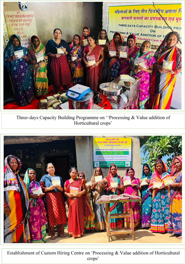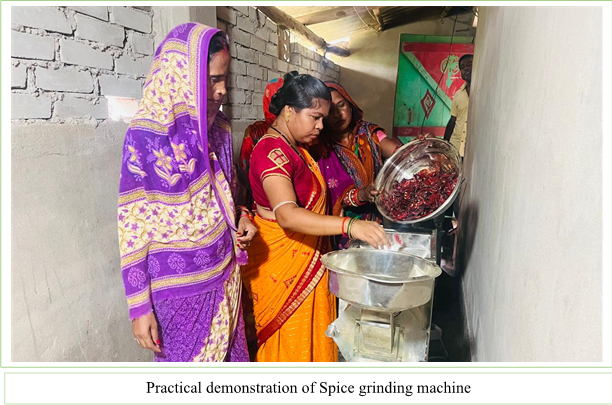 | Recognizing the scope of value addition in horticultural crops and the pivotal role of women in post-harvest management, the institute facilitated the establishment of a CHC dedicated to the processing and value addition of horticultural crops. To strengthen the group’s enterprise, essential equipment such as a spice grinding machine, vegetable shredder, potato peeler, gas stove, weighing machine, sack closure machine, and heat sealing machine were provided. These facilities will enable the group to produce a variety of value-added products including ground spices, garam masala, potato and tapioca chips, tomato sauce, and ready-to-serve beverages, thereby enhancing their income-generating opportunities. |