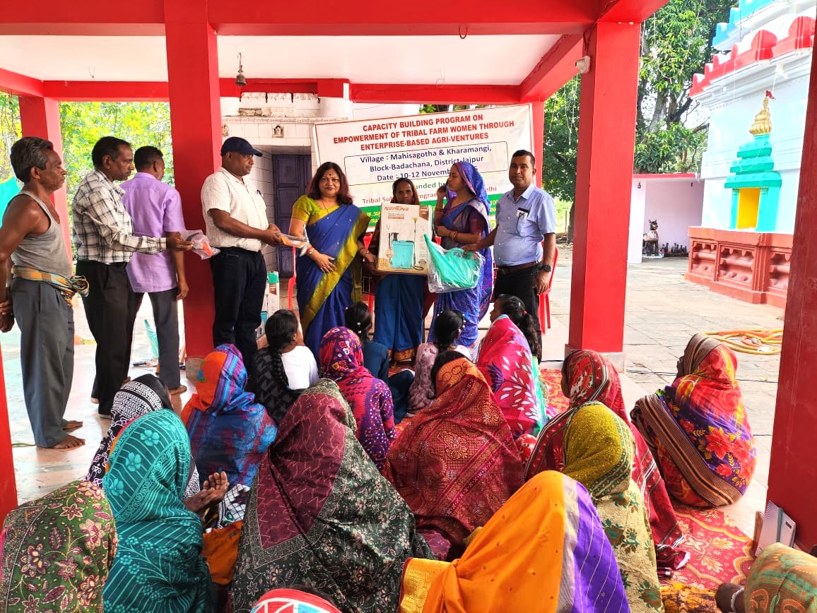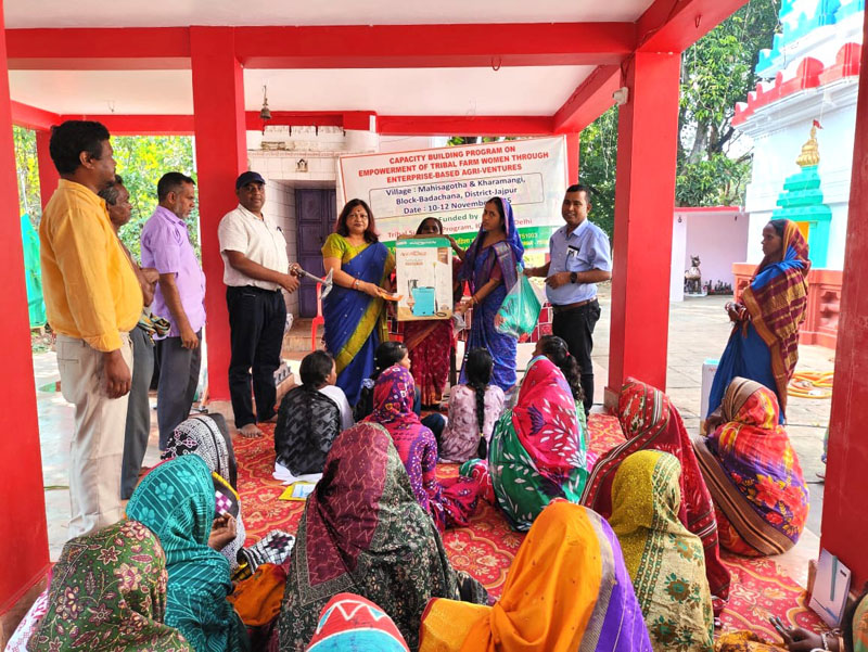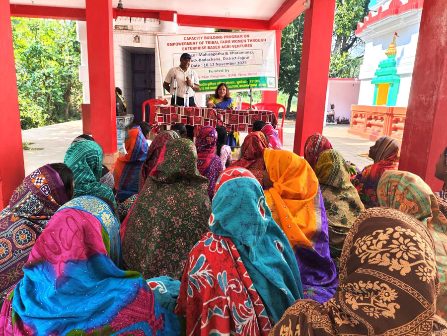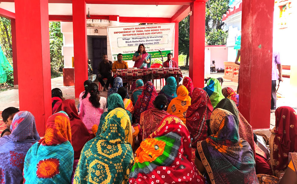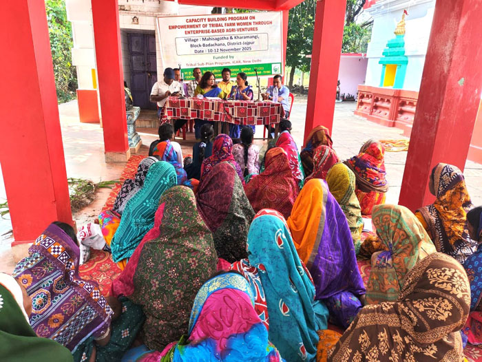 | Under Tribal Sub Plan (TSP), A three-days Capacity Building Program on “Empowerment of Tribal Women through Enterprise based Agri-Ventures” was organized during 10-12 November 2025 at Mahisagotha and Kharamangi Villages of Badachana Block of Jajpur District. In this programme thirty tribal women participated who were cultivators as well as agricultural labourers. The programme was aimed at motivating, mobilizing and skill development of tribal women farmers for uplifting their socio-economic condition to lead a healthy and stable life. This training was a foundation program to make the tribal women aware about the TSP programme. The programme started with creating awareness among the participants about the major objectives of Tribal Sub-Plan Programme of Govt. of India and also made them sensitized about the different schemes of Govt of India in general and particularly for tribal women. A need assessment of the participants was done to understand the current socio-economic status, perception, willingness and knowledge level of the tribal women farmers. Information on the demographic profile, major and minor crops produced, production, processing and marketing of the produce was also done during the programme. |